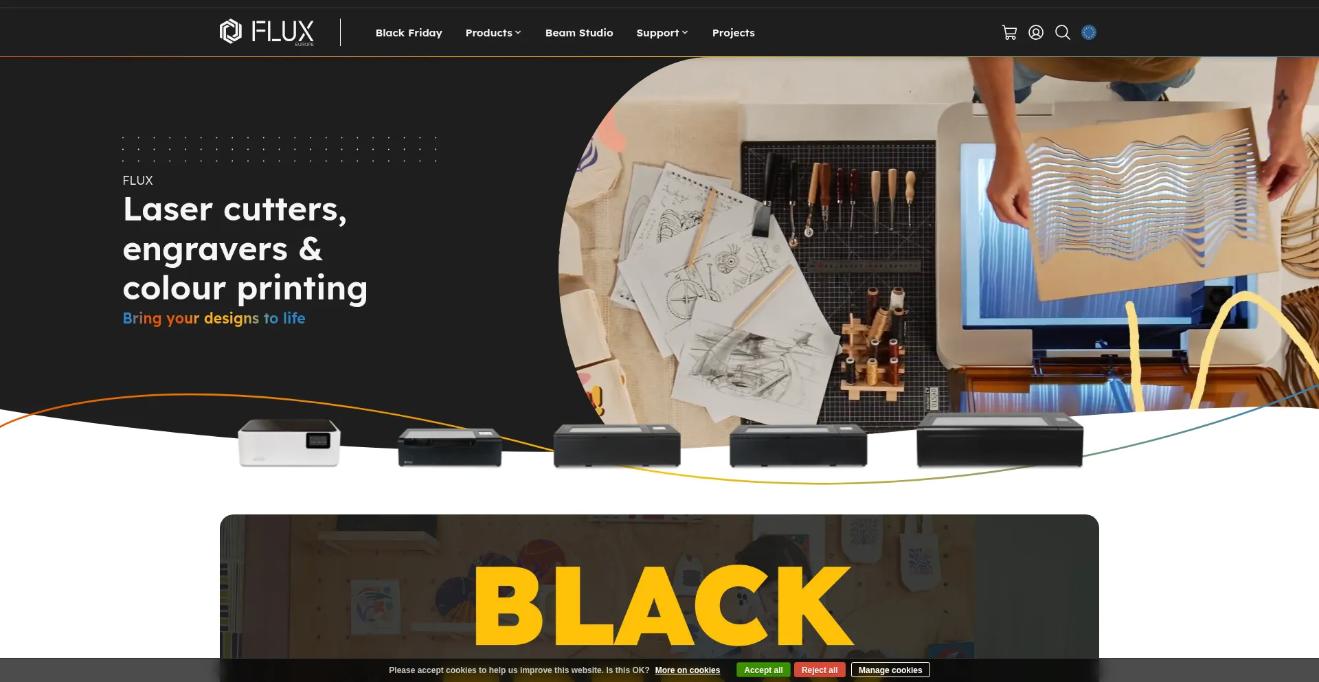 FLUX lasercutters. Ador, Beamo, Beambox, Beambox Pro and HEXA. High quality engraving and cutting in different materials.
