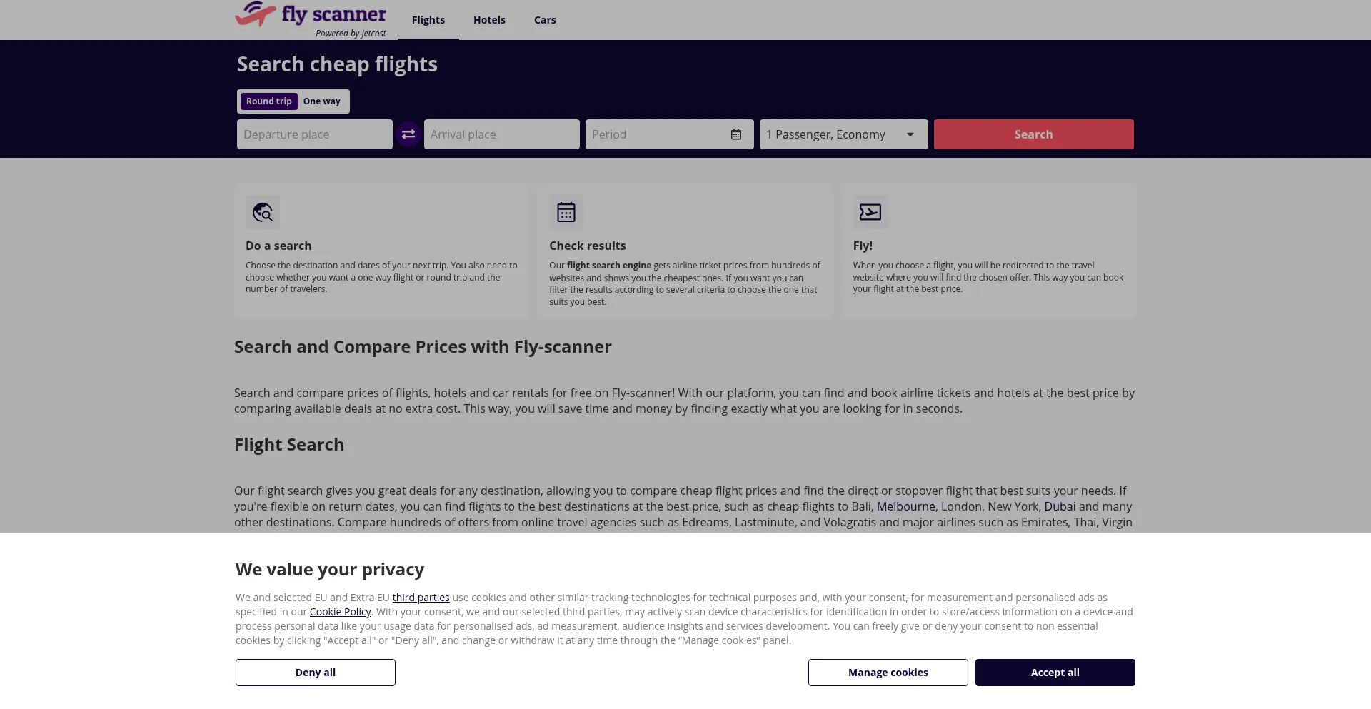 该网站实现符合GDPR或CCPA等隐私法规的cookie同意机制。这表明 fly-scanner.com 遵守数据保护标准并为用户提供对个人数据收集实践的控制。