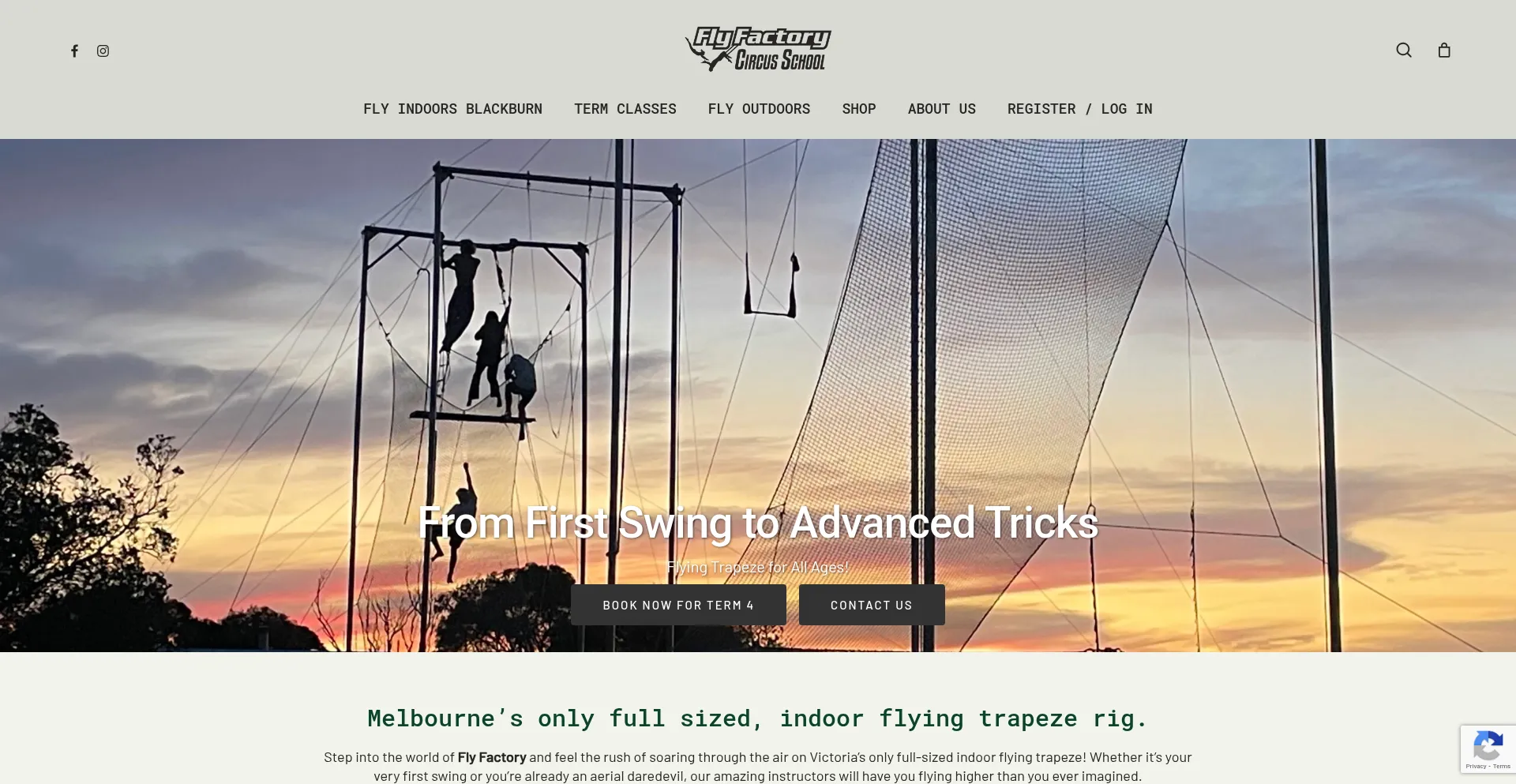 Flying Trapeze at Fly Factory Circus School. Home to Victoria’s only full-sized indoor flying trapeze rig. For All Ages.