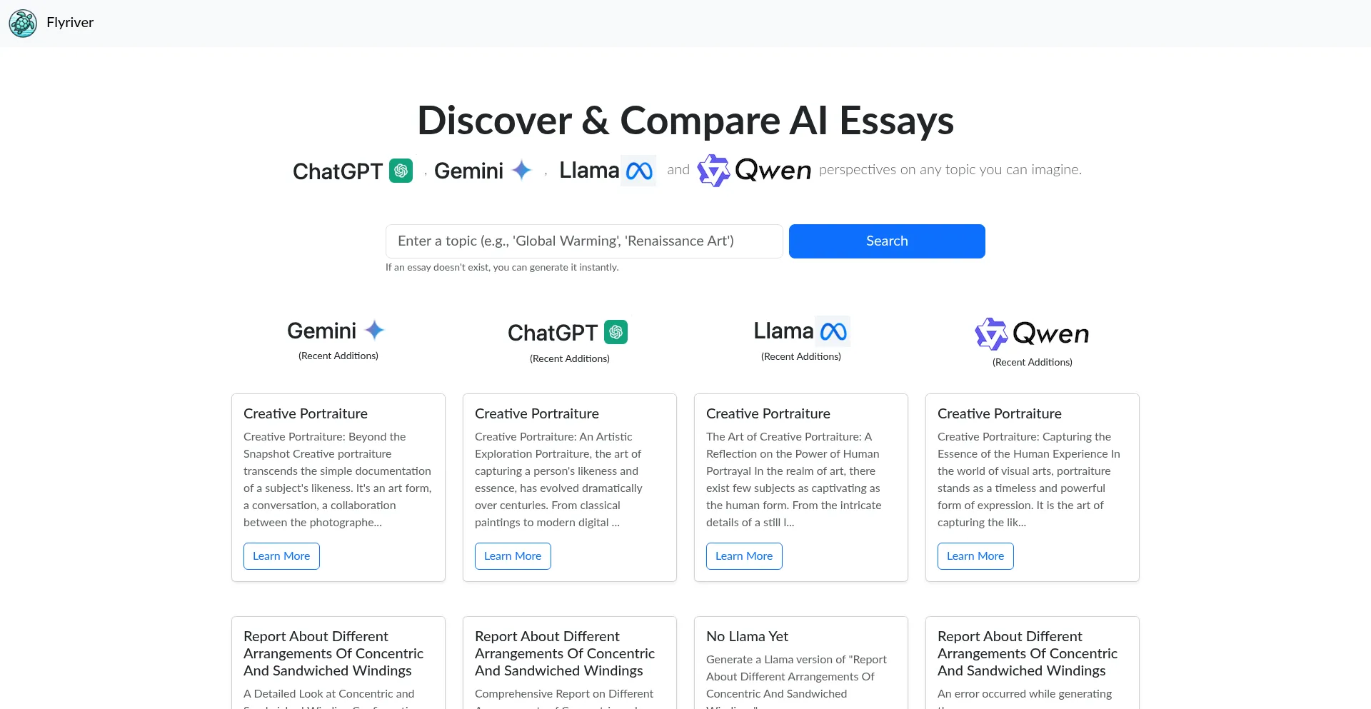 Explore thousands of AI-generated essays on a wide variety of topics at Flyriver Learning. Compare ChatGPT and Gemini perspectives side-by-side, generate new essays on-demand, a...