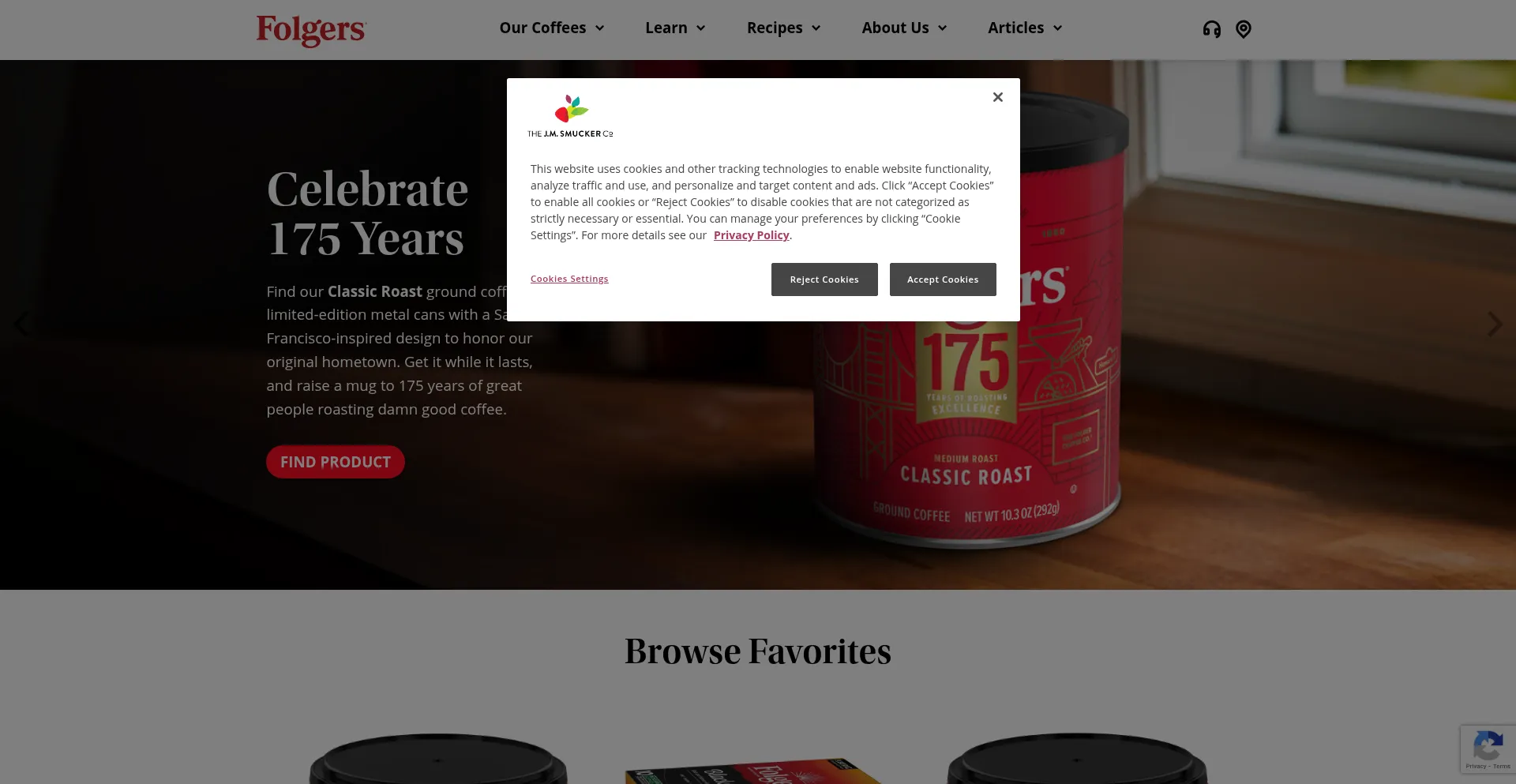 该网站实现符合GDPR或CCPA等隐私法规的cookie同意机制。这表明 folgerscoffee.com 遵守数据保护标准并为用户提供对个人数据收集实践的控制。