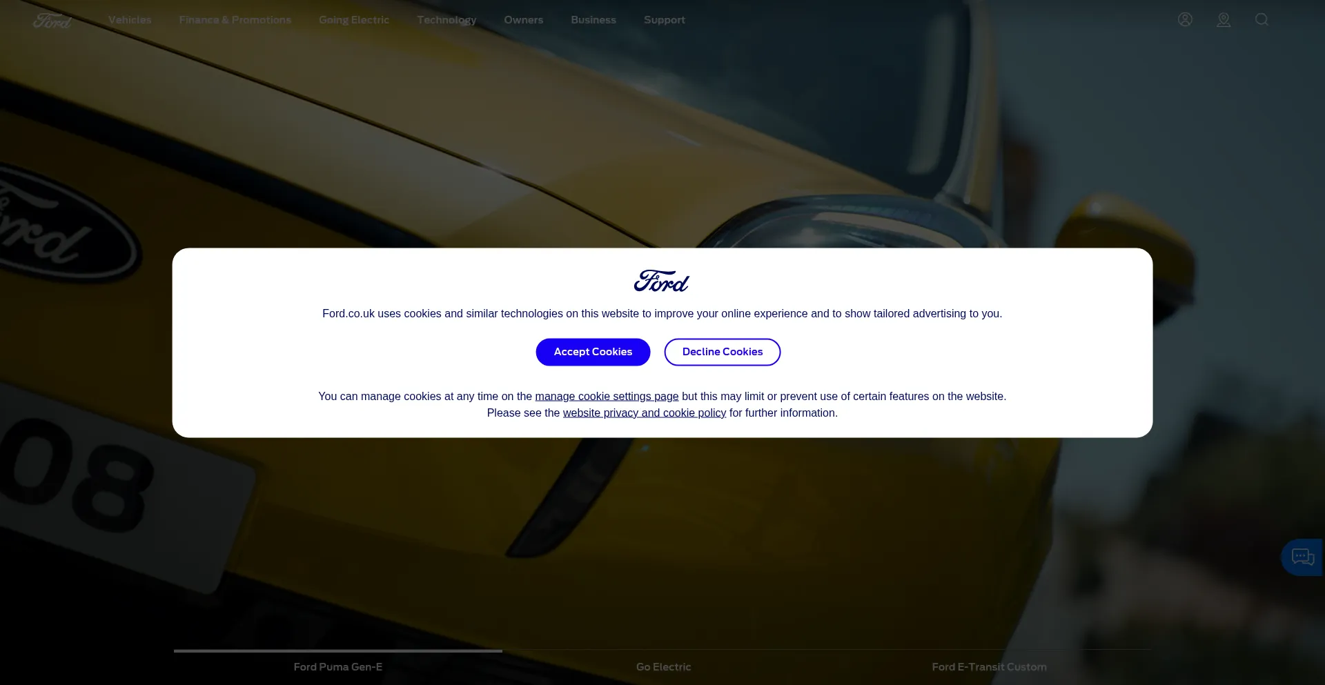 该网站实现符合GDPR或CCPA等隐私法规的cookie同意机制。这表明 ford.co.uk 遵守数据保护标准并为用户提供对个人数据收集实践的控制。