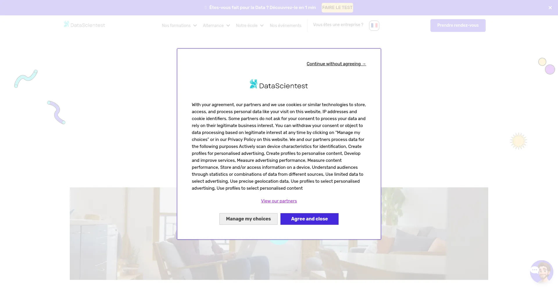 该网站实现符合GDPR或CCPA等隐私法规的cookie同意机制。这表明 formation.datascientest.com 遵守数据保护标准并为用户提供对个人数据收集实践的控制。