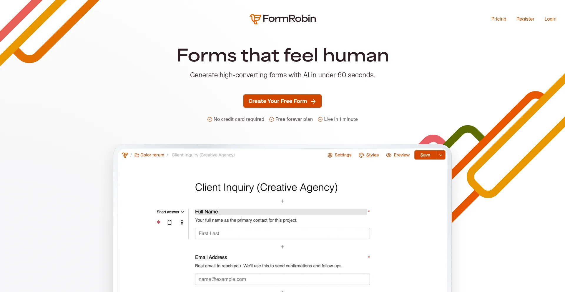 Create beautiful, high-converting forms with AI in under 60 seconds. Free forever plan with unlimited forms. No credit card required.