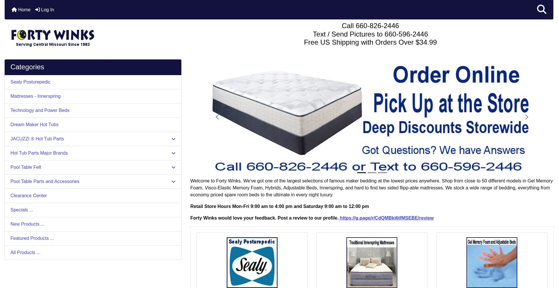 Forty Winks : - Hot Tub Parts Major Brands Pool Table Parts and Accessories Mattresses - Innerspring Clearance Center Technology and Power Beds JACUZZI ® Hot Tub Parts Pool Ta...