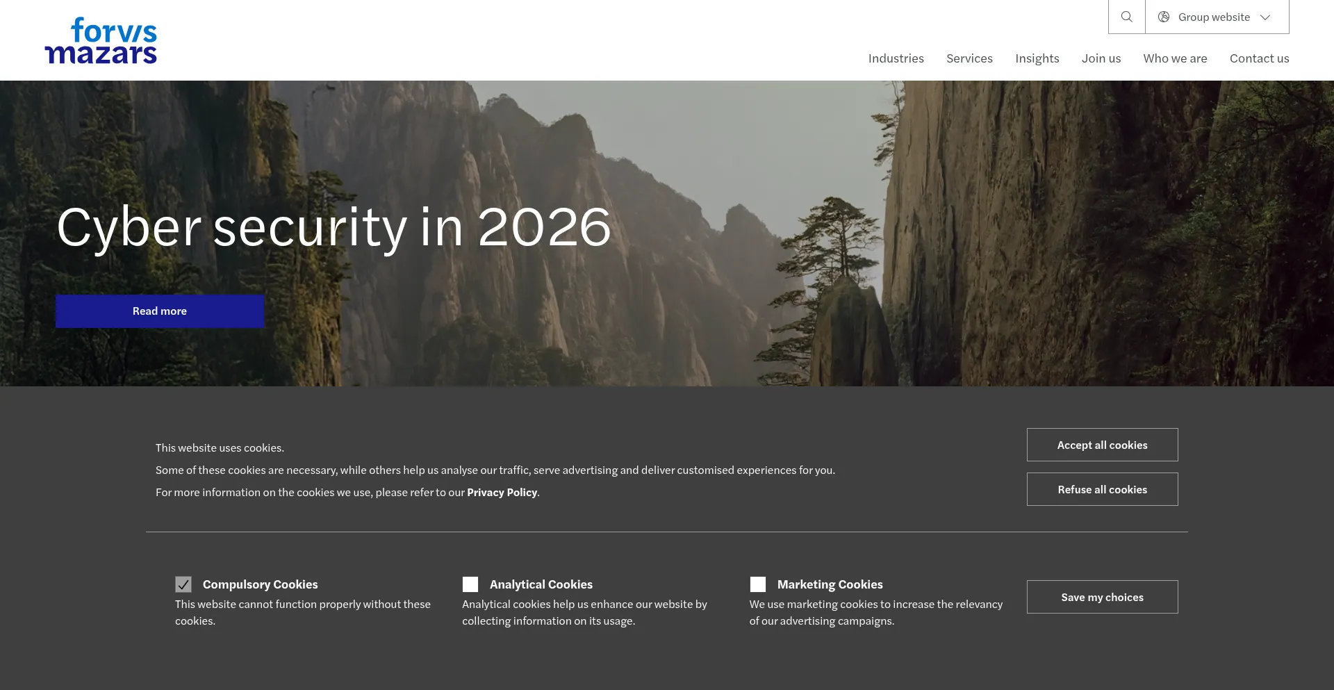 网站上存在社交媒体链接表明 forvismazars.com 在社交媒体上维护官方账户,这是可信度和参与度的积极信号。