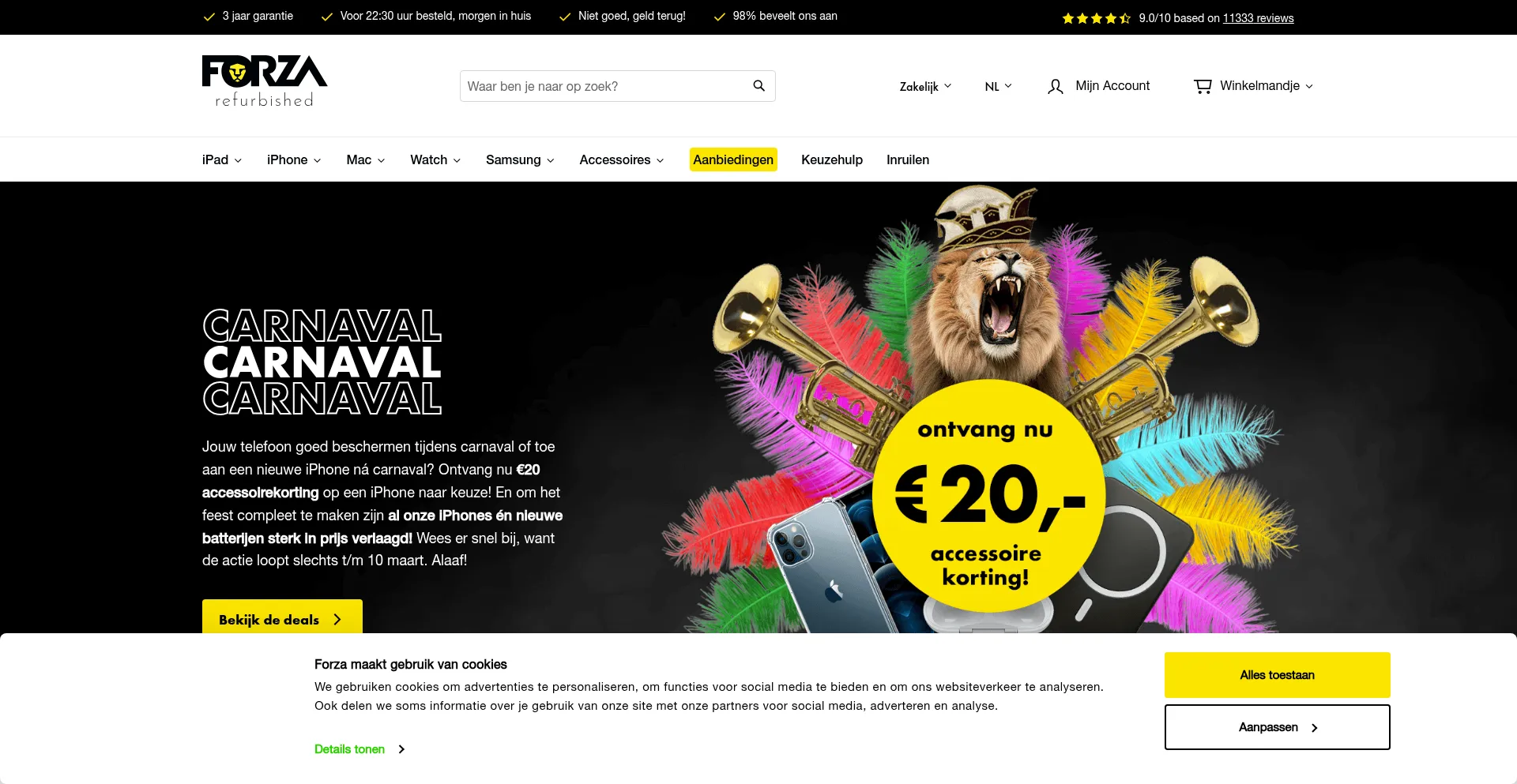 该网站实现符合GDPR或CCPA等隐私法规的cookie同意机制。这表明 forza-refurbished.nl 遵守数据保护标准并为用户提供对个人数据收集实践的控制。
