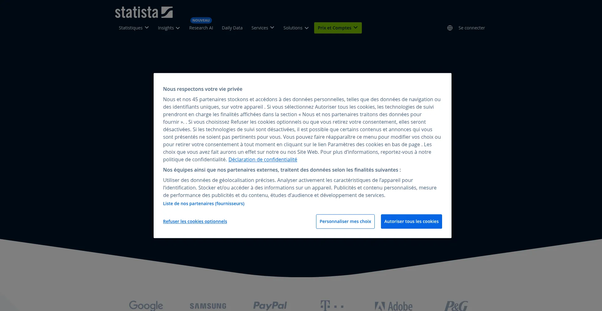 该网站实现符合GDPR或CCPA等隐私法规的cookie同意机制。这表明 fr.statista.com 遵守数据保护标准并为用户提供对个人数据收集实践的控制。