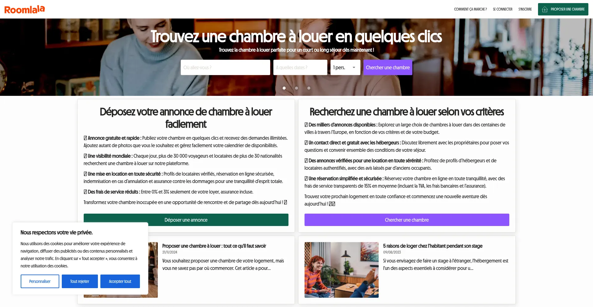 Recherchez une chambre à louer ou publiez votre annonce sur Roomlala. Trouvez un hébergement abordable partout en France et ailleurs !