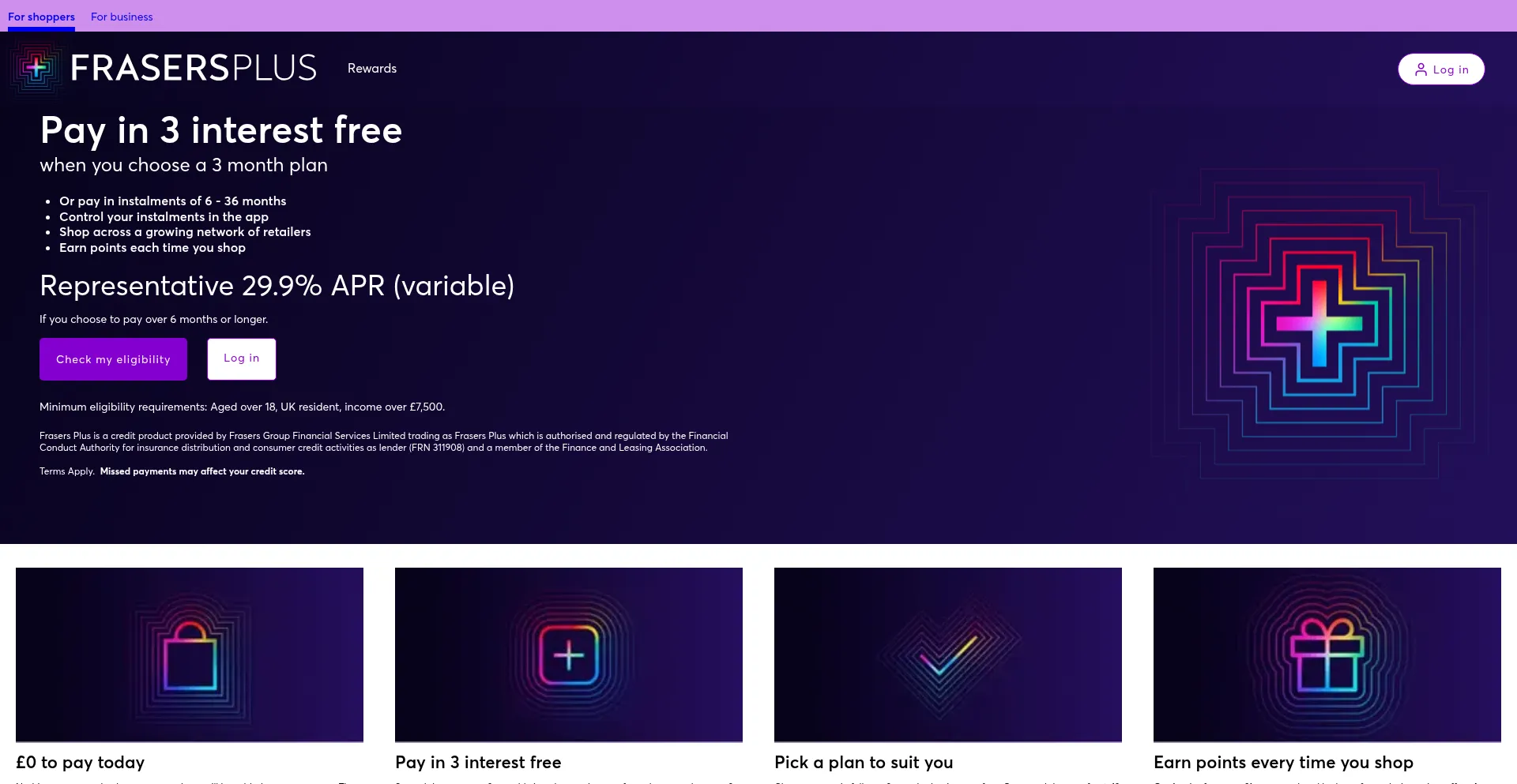 Frasers Plus: Nothing to pay at the checkout. Choose pay in 3, interest free. Or, spread the cost up to 36 months. Earn points each time you shop. Representative APR: 29.9% APR ...