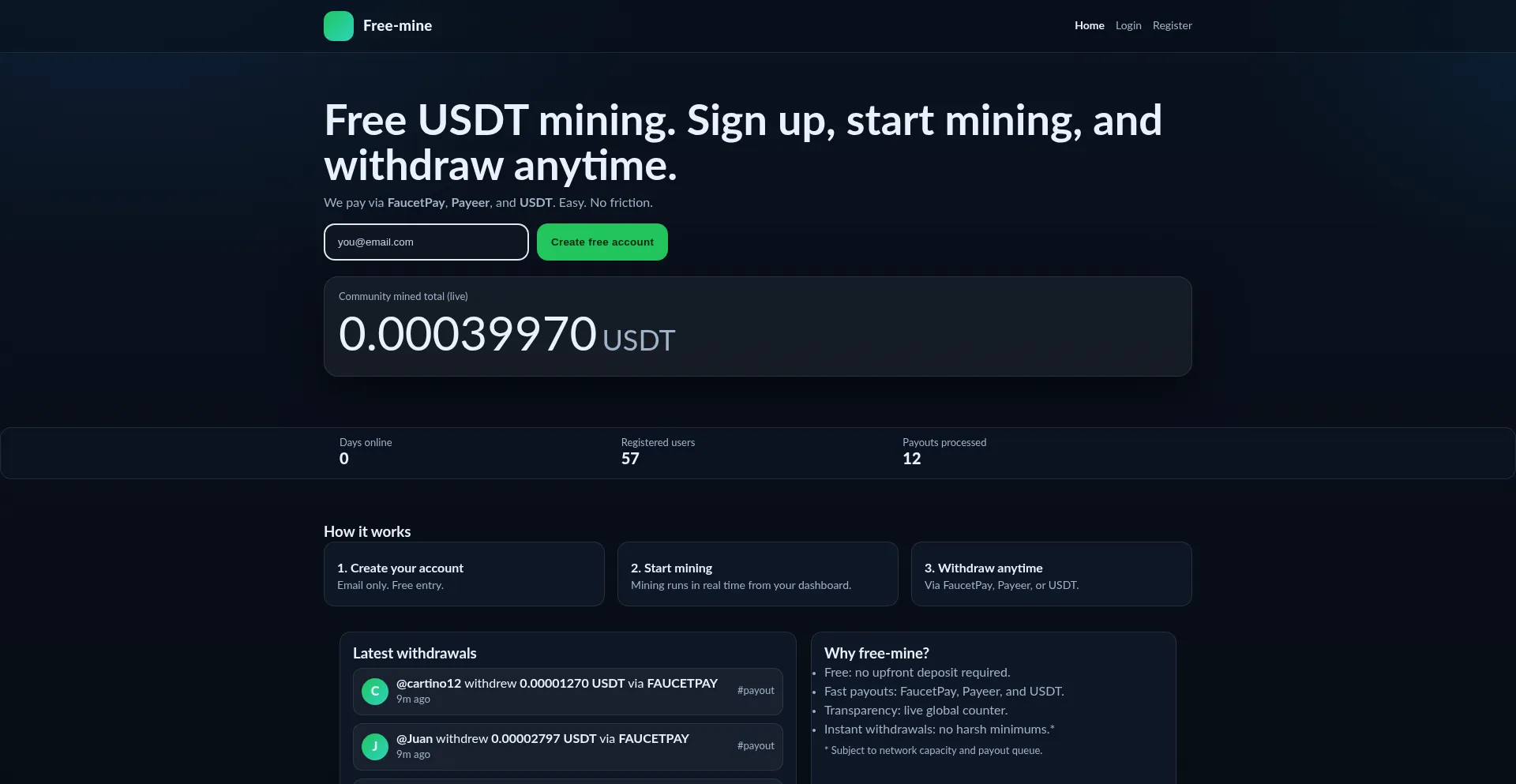 网站 free-mine.com 可能提供云挖矿服务或加密货币挖矿投资。一些平台提供合法的挖矿租赁服务,而其他平台可能使用虚假的挖矿仪表板来显示无法提取的虚拟收益。