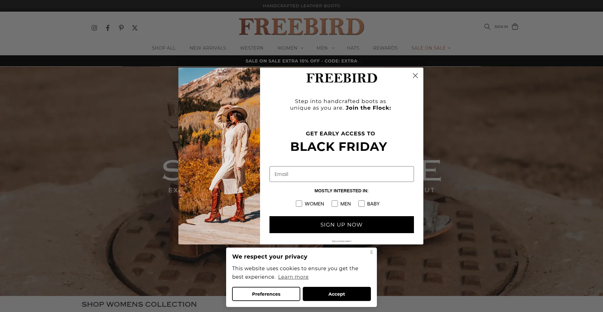 该网站实现符合GDPR或CCPA等隐私法规的cookie同意机制。这表明 freebirdstores.com 遵守数据保护标准并为用户提供对个人数据收集实践的控制。