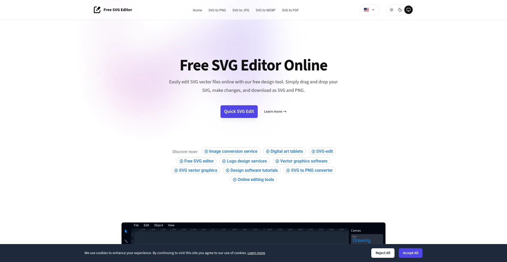 该网站实现符合GDPR或CCPA等隐私法规的cookie同意机制。这表明 freesvgeditor.com 遵守数据保护标准并为用户提供对个人数据收集实践的控制。