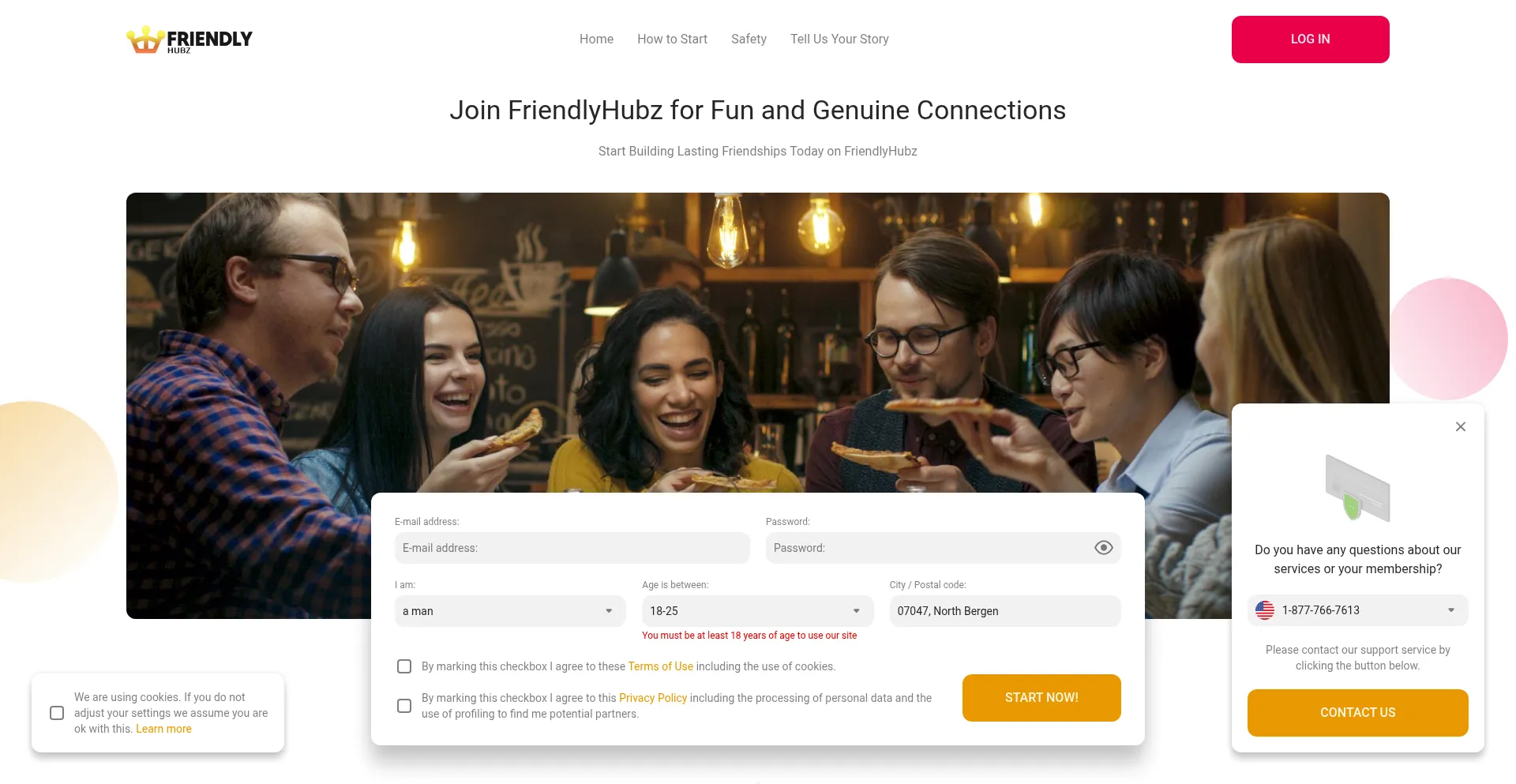 该网站实现数据收集表单,请求个人信息,包括姓名、电子邮件地址、电话号码或其他敏感详细信息。用户应验证 friendlyhubz.com 的合法性并在提交个人数据前查看隐私政策。