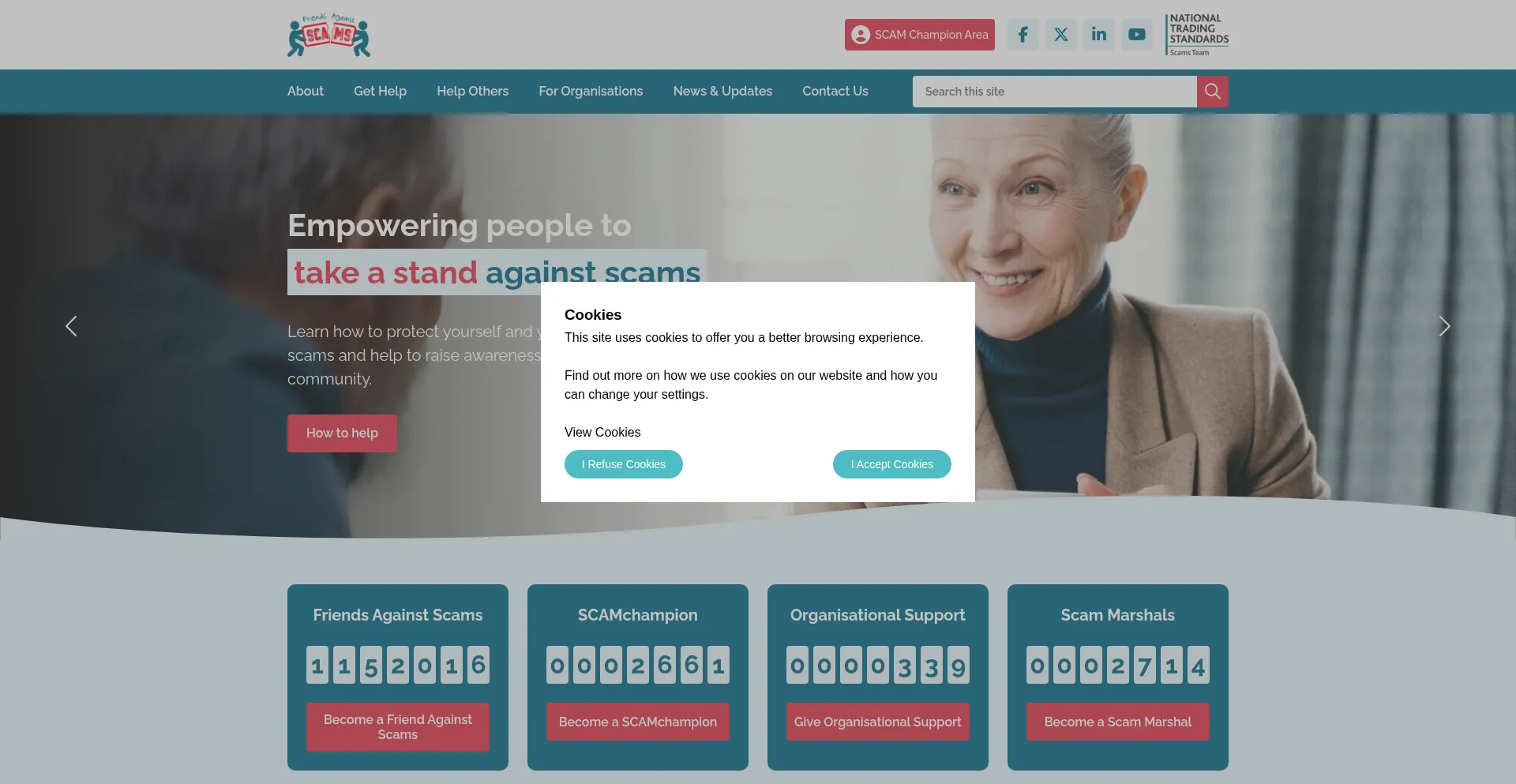 该网站实现符合GDPR或CCPA等隐私法规的cookie同意机制。这表明 friendsagainstscams.org.uk 遵守数据保护标准并为用户提供对个人数据收集实践的控制。