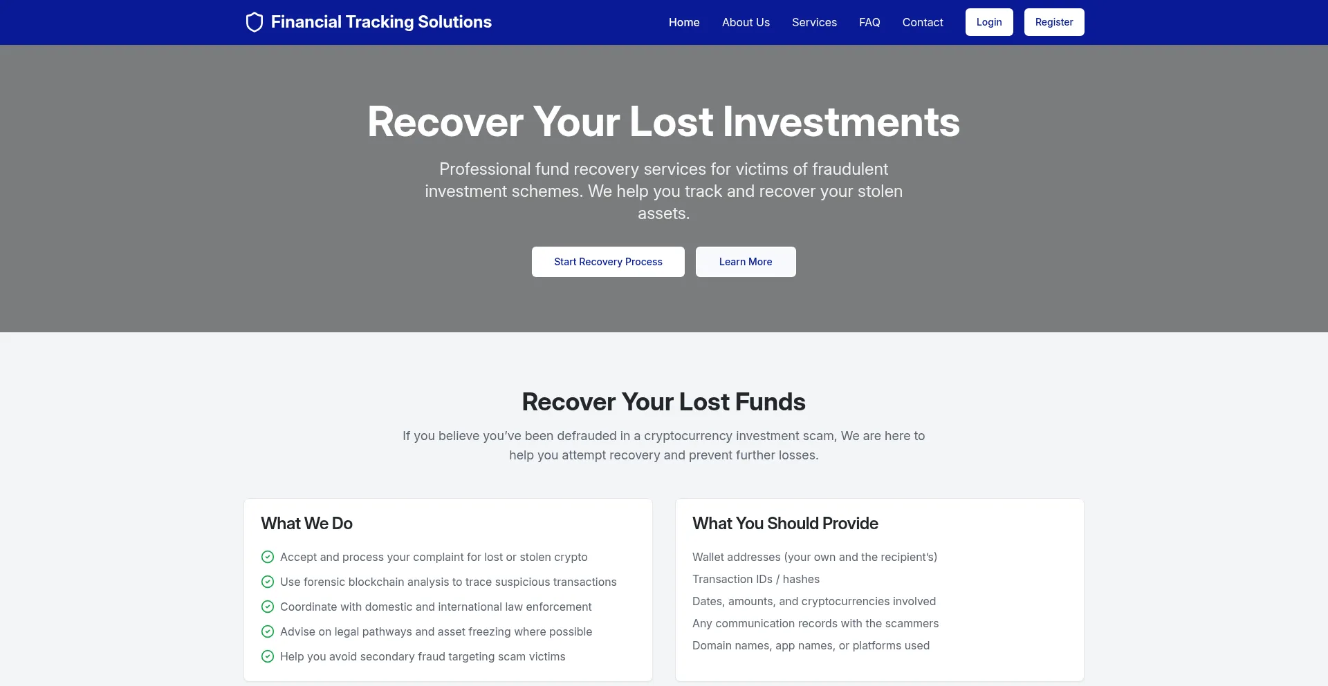 网站 fts-hub.com 宣传针对丢失或被盗资产的资金恢复服务。虽然一些在应急费用结构上运营,其他可能需要预付款,这可能表明欺诈运营。在聘请此类服务前验证凭据和监管合规性。