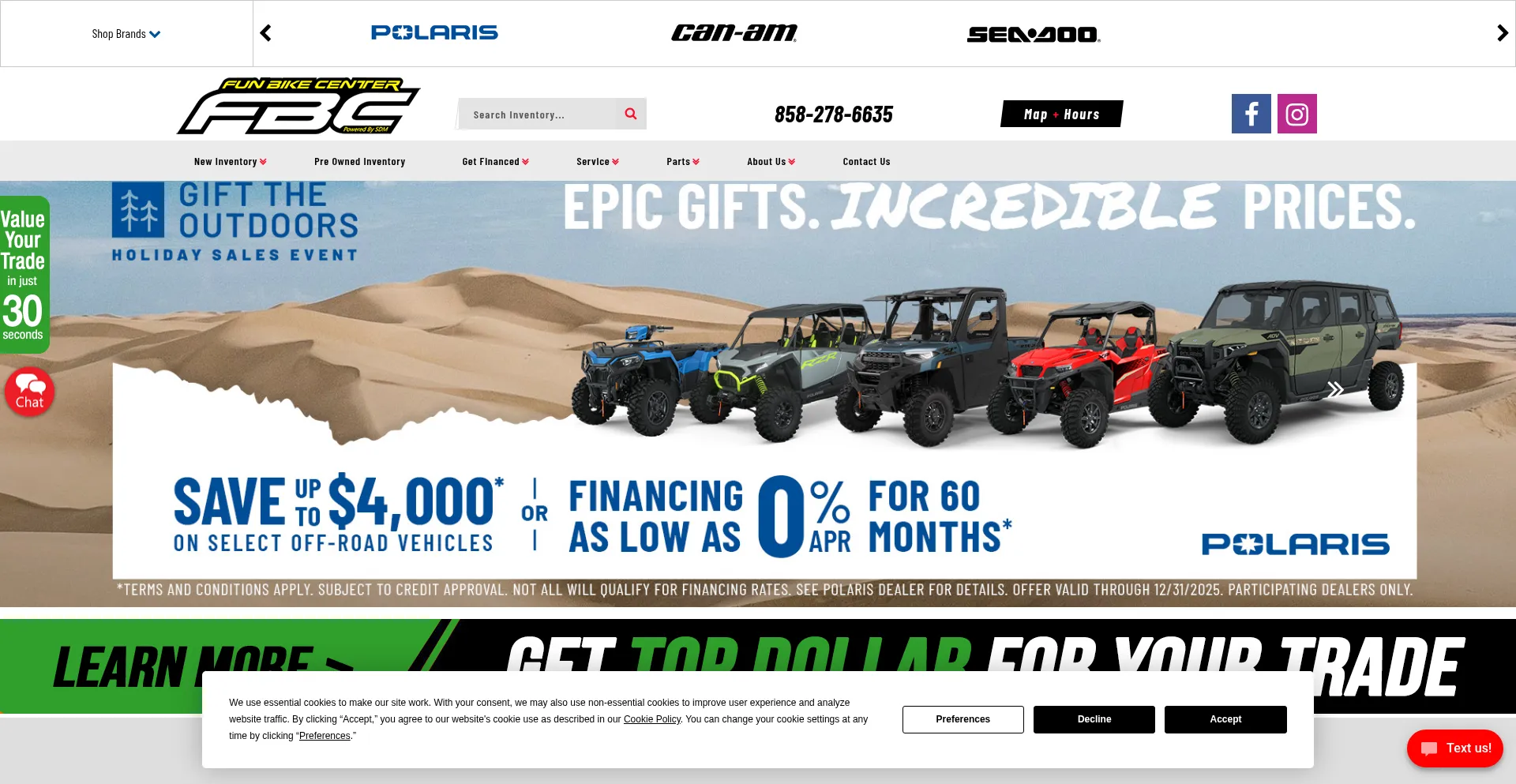 Fun Bike Center is a powersports dealership located in San Diego, CA. We sell new and pre-owned Motorcycles, PWC and UTVs from Kawasaki, Honda, Yamaha, Can-Am, Suzuki, SSR, Arct...