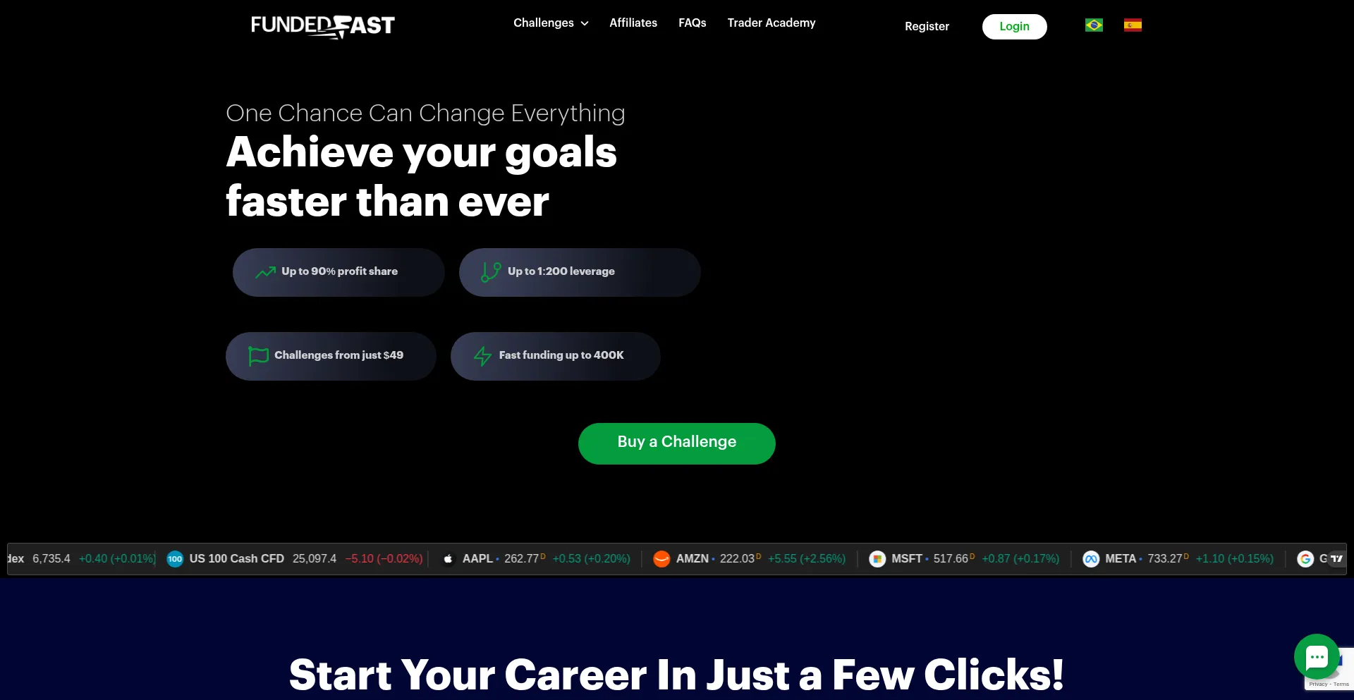 One Chance Can Change Everything Achieve your goals faster than ever Up to 90% profit share Up to 1:200 leverage Challenges from just $49 Fast funding up to 400K Buy a Challenge...