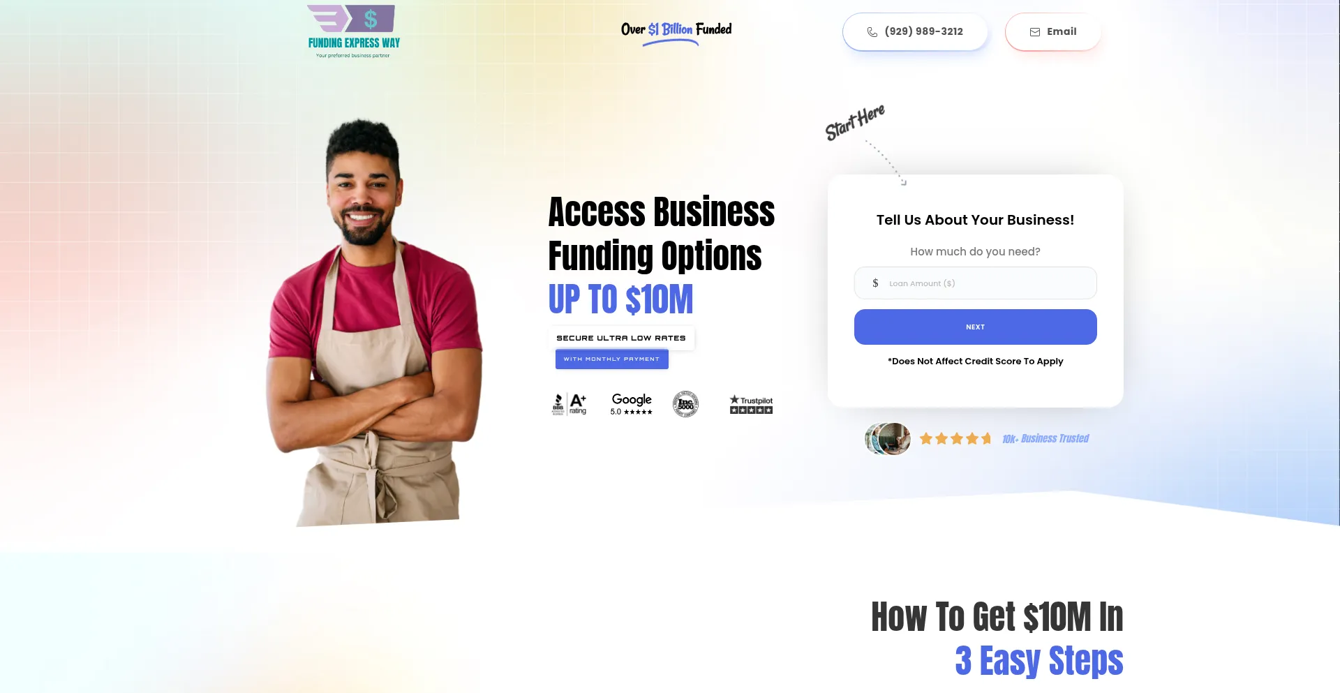 该网站实现数据收集表单,请求个人信息,包括姓名、电子邮件地址、电话号码或其他敏感详细信息。用户应验证 fundingexpressway.com 的合法性并在提交个人数据前查看隐私政策。
