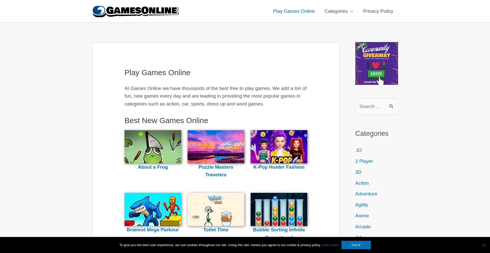 该网站实现符合GDPR或CCPA等隐私法规的cookie同意机制。这表明 gamesonline.org 遵守数据保护标准并为用户提供对个人数据收集实践的控制。