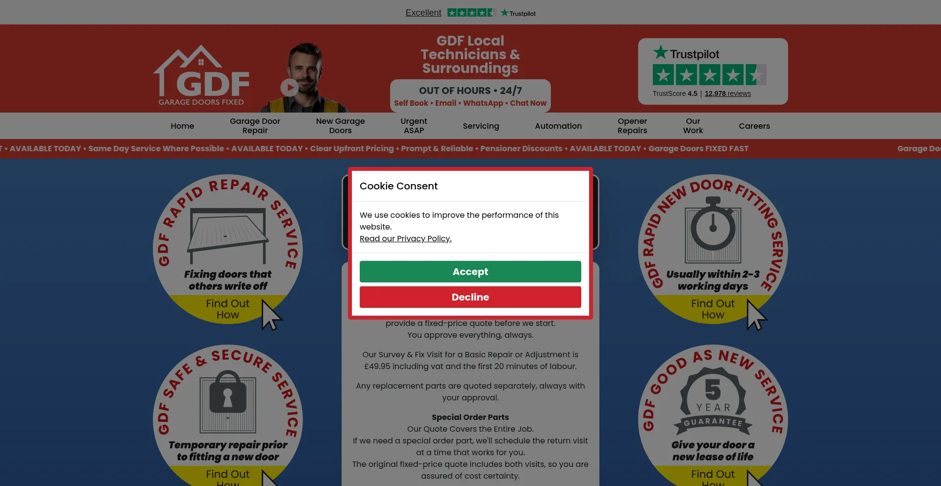 该网站实现符合GDPR或CCPA等隐私法规的cookie同意机制。这表明 garagedoorsfixed.co.uk 遵守数据保护标准并为用户提供对个人数据收集实践的控制。