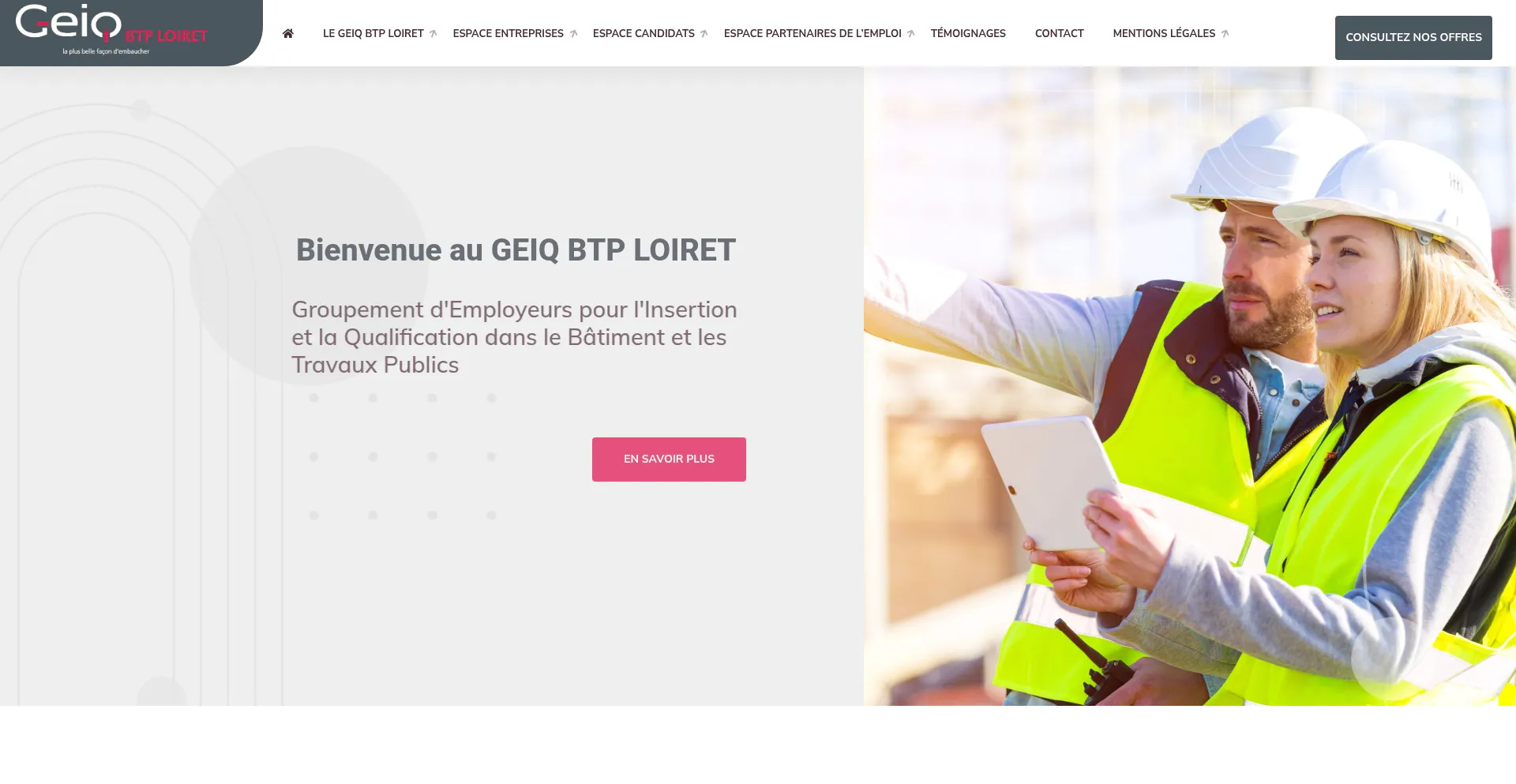 Bienvenue au GEIQ BTP Loiret, Groupement d'Employeurs pour l'Insertion et la Qualification spécialisé dans le Bâtiment et les Travaux Publics. En Savoir Plus...