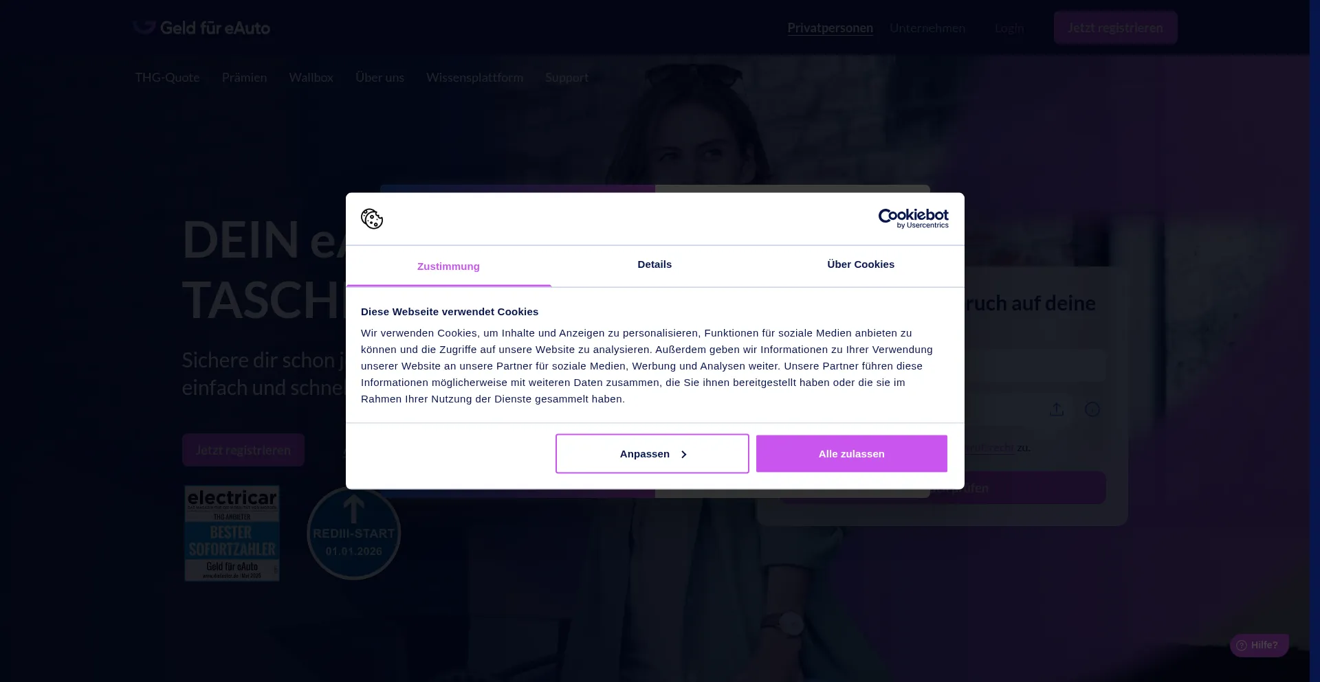 该网站实现符合GDPR或CCPA等隐私法规的cookie同意机制。这表明 geld-fuer-eauto.de 遵守数据保护标准并为用户提供对个人数据收集实践的控制。