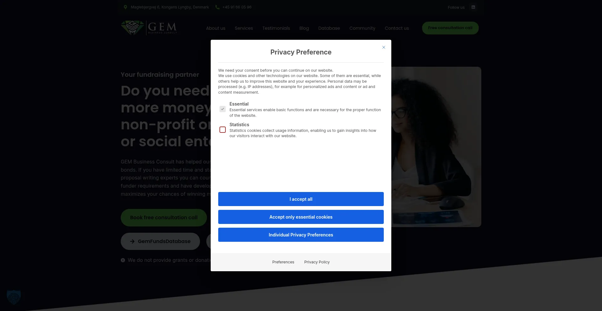 该网站实现数据收集表单,请求个人信息,包括姓名、电子邮件地址、电话号码或其他敏感详细信息。用户应验证 gembusinessconsult.com 的合法性并在提交个人数据前查看隐私政策。