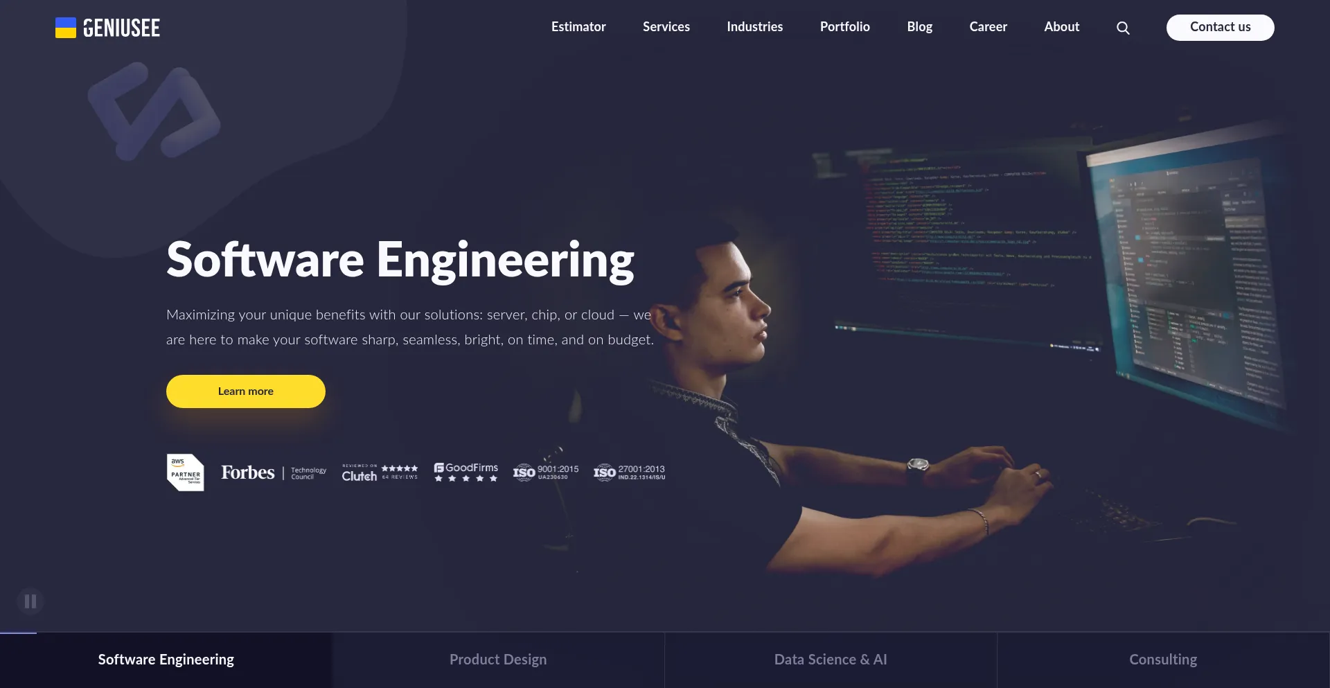 geniusee.com 使用 Bootstrap,这是一个广泛采用的开源响应式网页开发框架。Bootstrap 通过标准化组件和样式实现移动友好界面的高效创建。