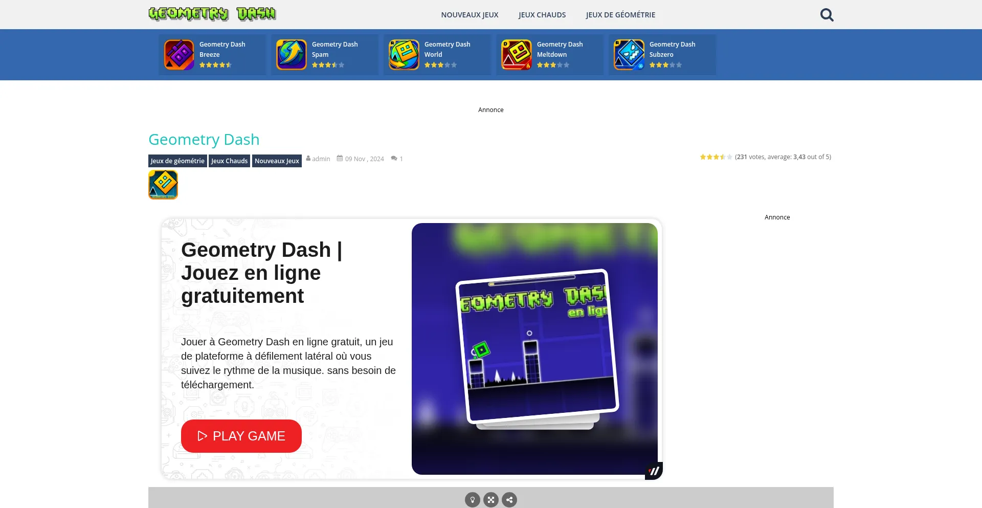 Jouer à Geometry Dash en ligne gratuit, un jeu de plateforme à défilement latéral où vous suivez le rythme de la musique. sans besoin de téléchargement.