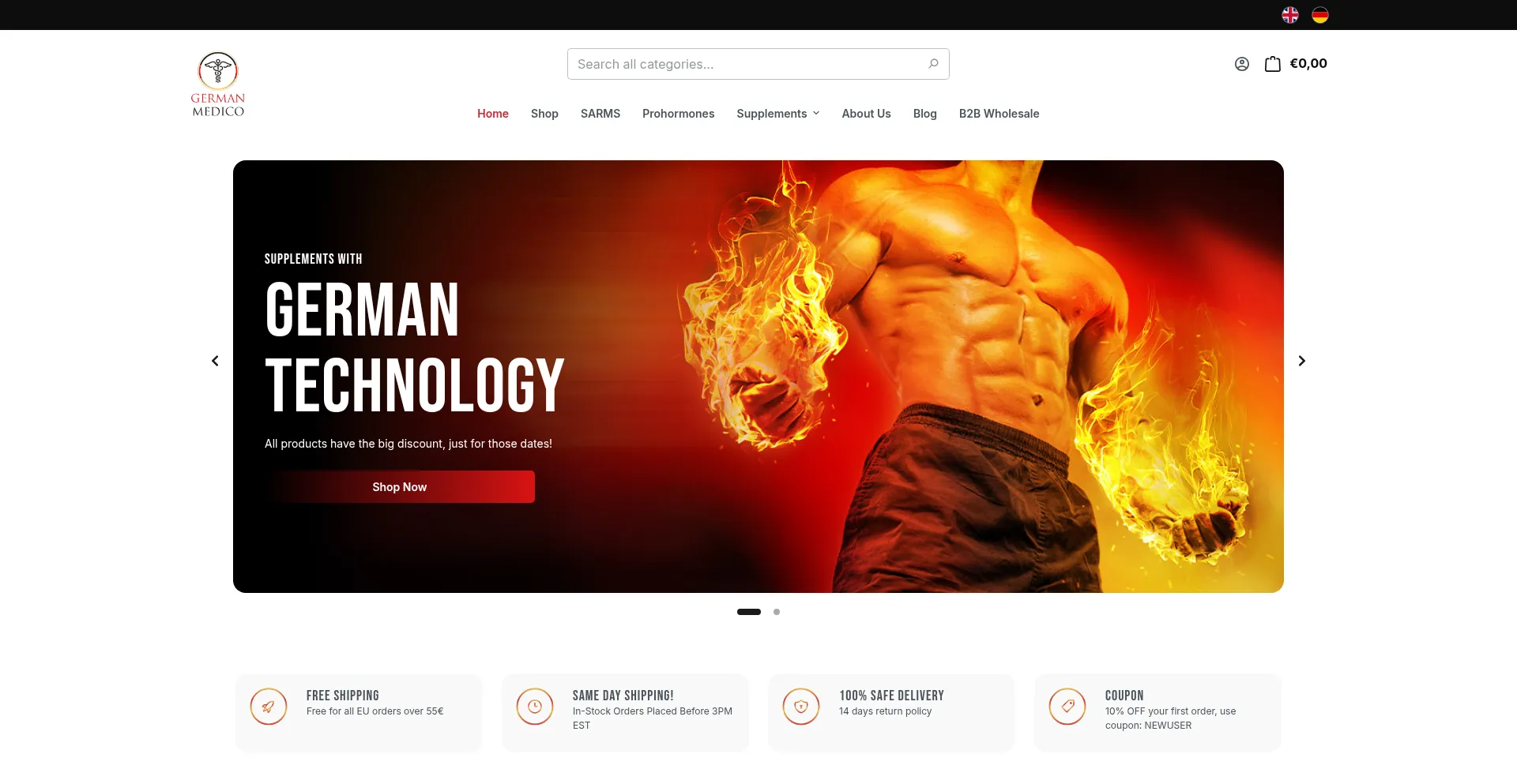 该网站利用流行产品名称和品牌来吸引流量并产生用户兴趣。这些产品可能通过促销活动或折扣策略提供,旨在增加 germanmedico-shop.com 的访客参与度和转化率。