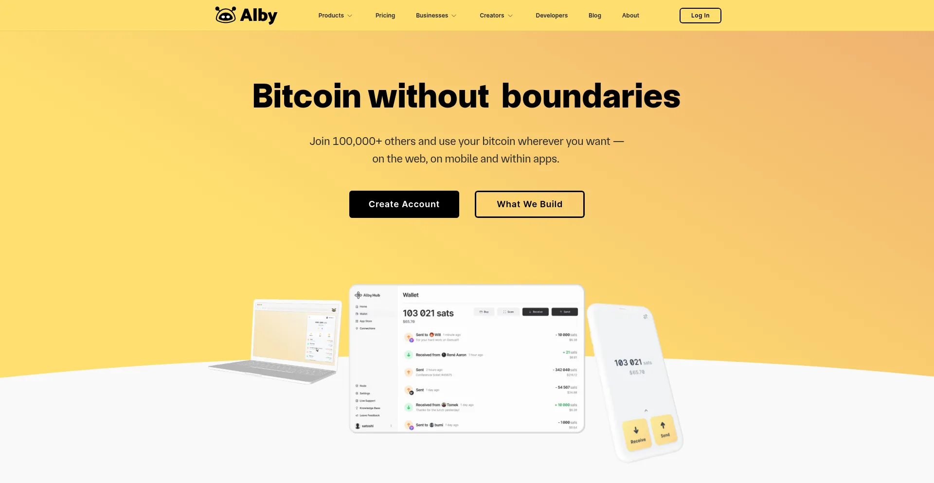 Alby offers open-source wallets and tools for using Bitcoin as everyday money online, in apps, and in person. Try Alby Cloud or self-host Alby Hub.