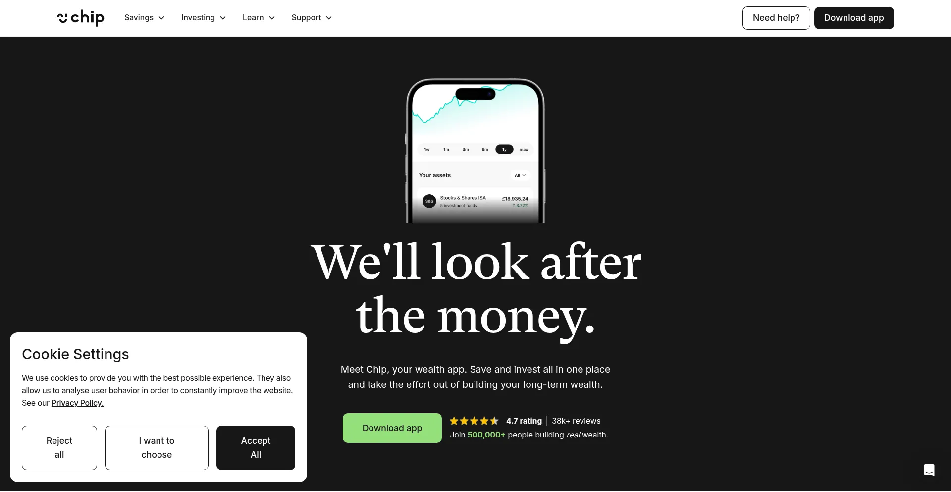 Chip is an investing and savings app. Download Chip to begin investing in funds, our general investment account and open a savings account.