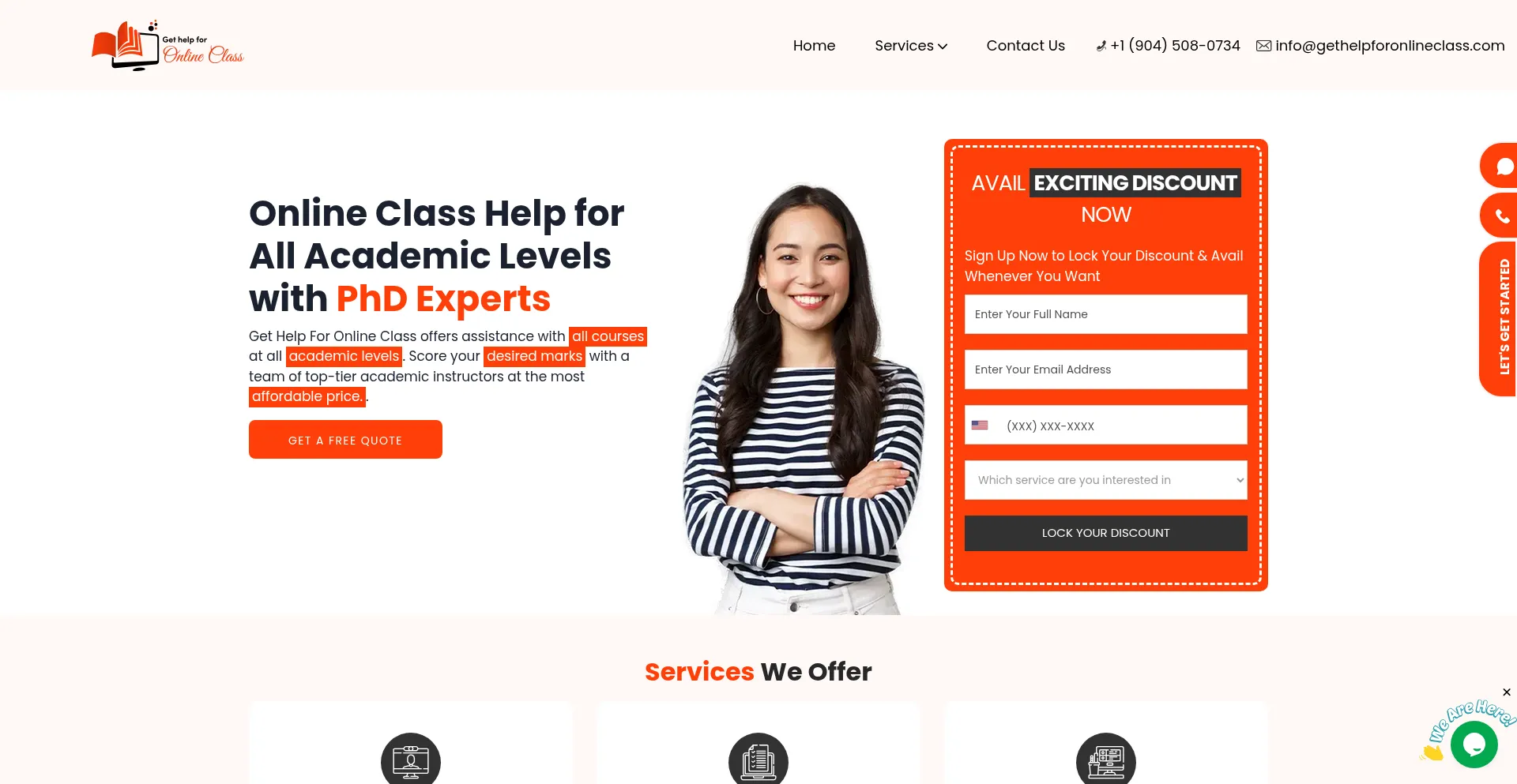 该网站实现数据收集表单,请求个人信息,包括姓名、电子邮件地址、电话号码或其他敏感详细信息。用户应验证 gethelpforonlineclass.com 的合法性并在提交个人数据前查看隐私政策。