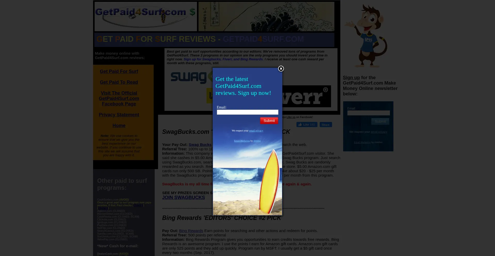 GetPaid4Surf.com lists and reviews companies that pay you for surfing the web. Reviews of paid to surf, paid to read, downline clubs, cash for referrals, cash for surveys, and m...
