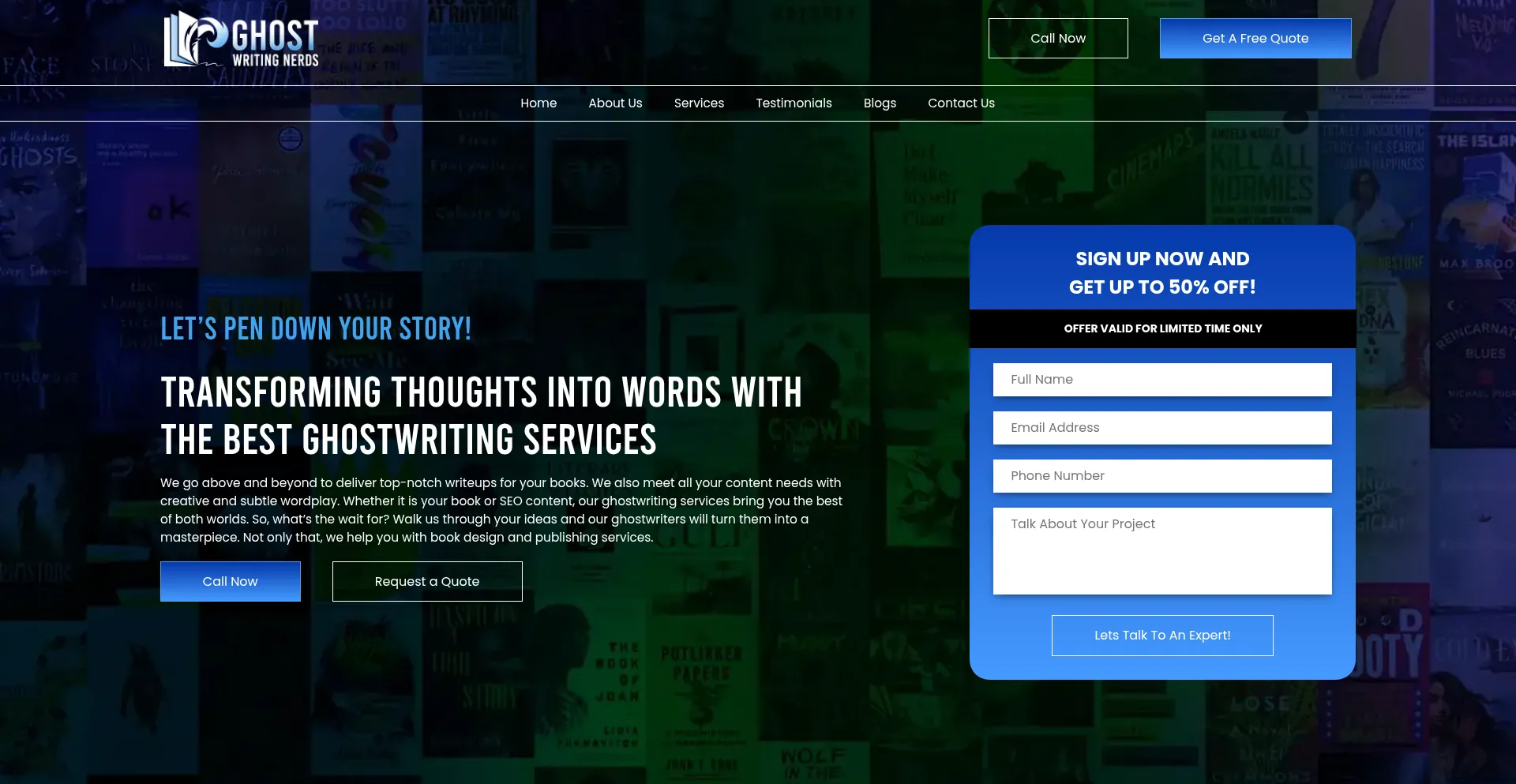 该网站实现数据收集表单,请求个人信息,包括姓名、电子邮件地址、电话号码或其他敏感详细信息。用户应验证 ghostwritingnerds.com 的合法性并在提交个人数据前查看隐私政策。