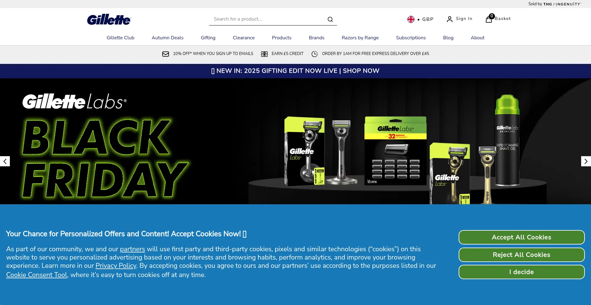 该网站实现符合GDPR或CCPA等隐私法规的cookie同意机制。这表明 gillette.co.uk 遵守数据保护标准并为用户提供对个人数据收集实践的控制。