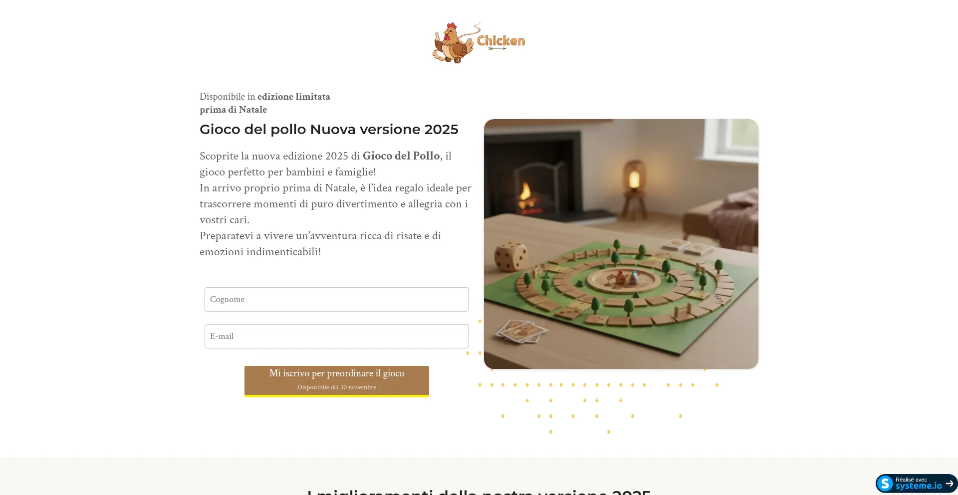 该网站实现数据收集表单,请求个人信息,包括姓名、电子邮件地址、电话号码或其他敏感详细信息。用户应验证 gioco-del-pollo.systeme.io 的合法性并在提交个人数据前查看隐私政策。