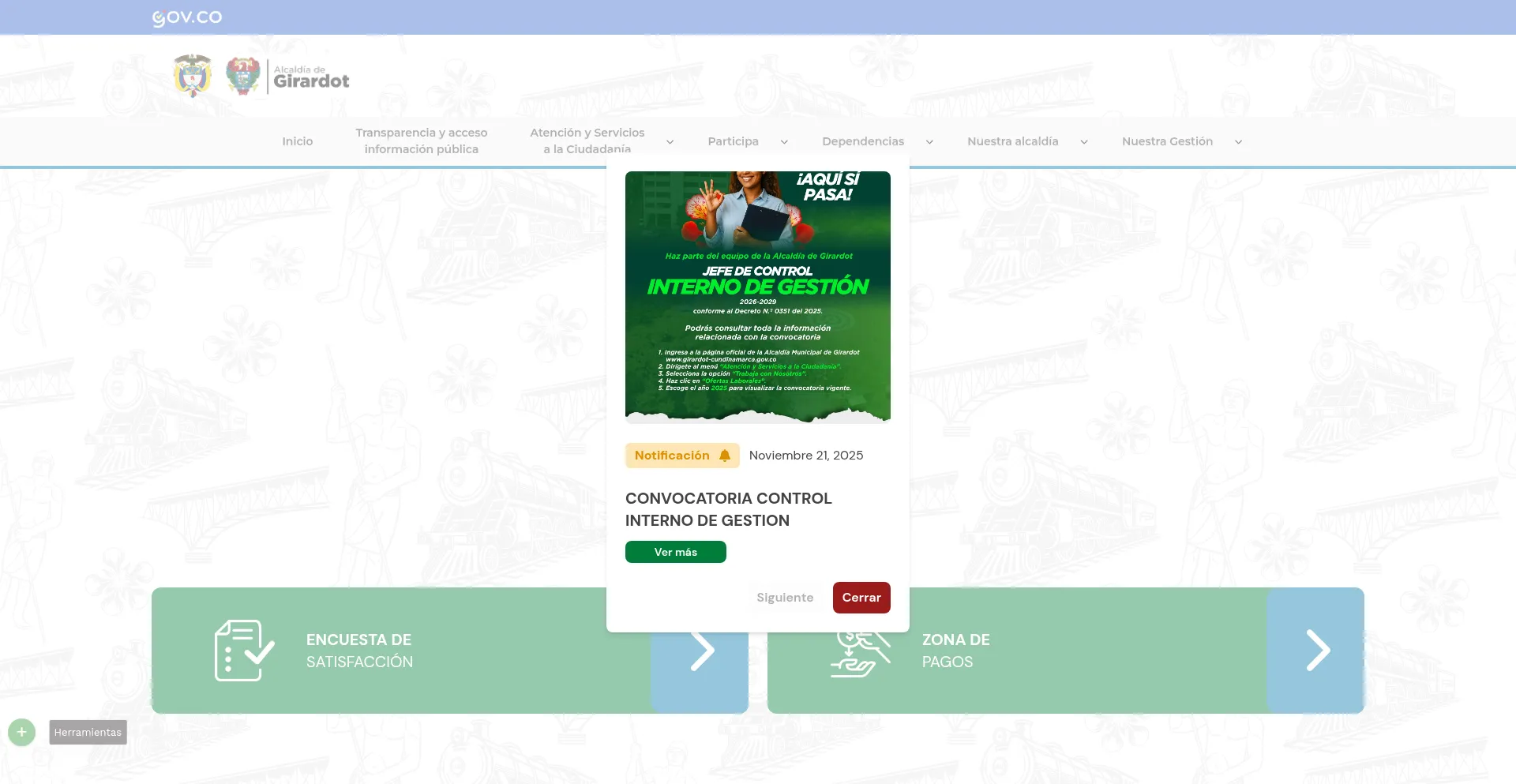网站上存在社交媒体链接表明 girardot-cundinamarca.gov.co 在社交媒体上维护官方账户,这是可信度和参与度的积极信号。