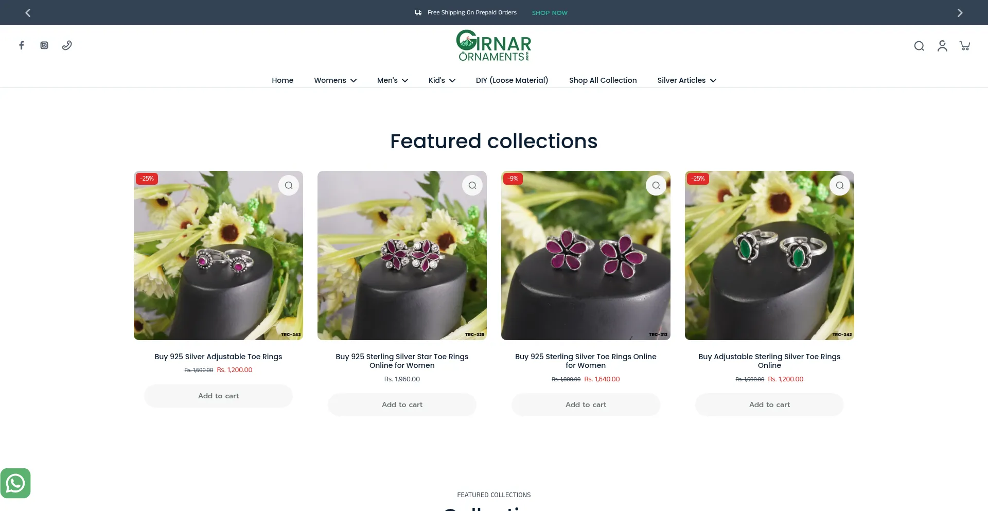 网站上存在社交媒体链接表明 girnarornaments.com 在社交媒体上维护官方账户,这是可信度和参与度的积极信号。