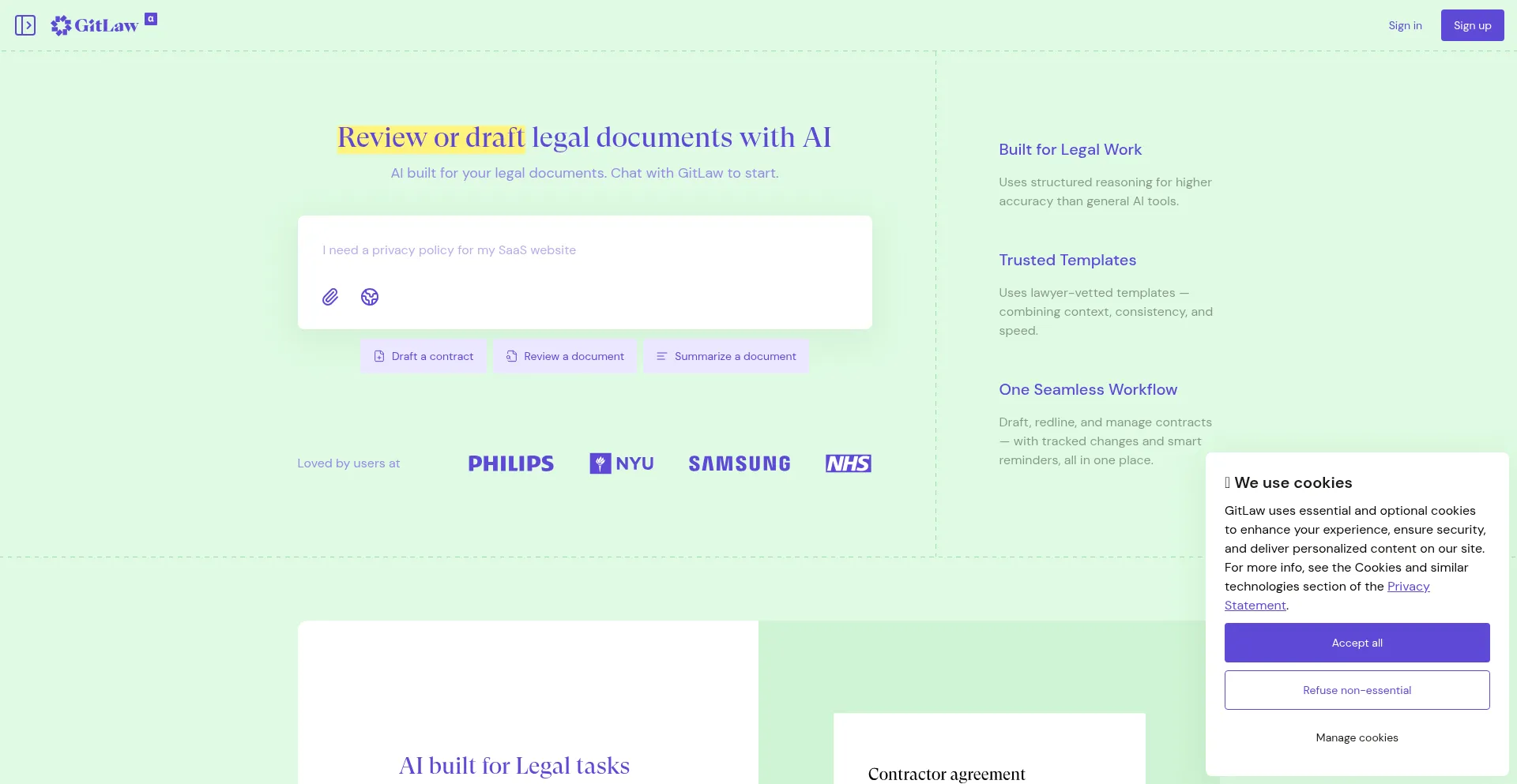 GitLaw AI contract platform creates professional legal agreements from chat prompts and redlines documents instantly. Skip weeks, close deals faster.