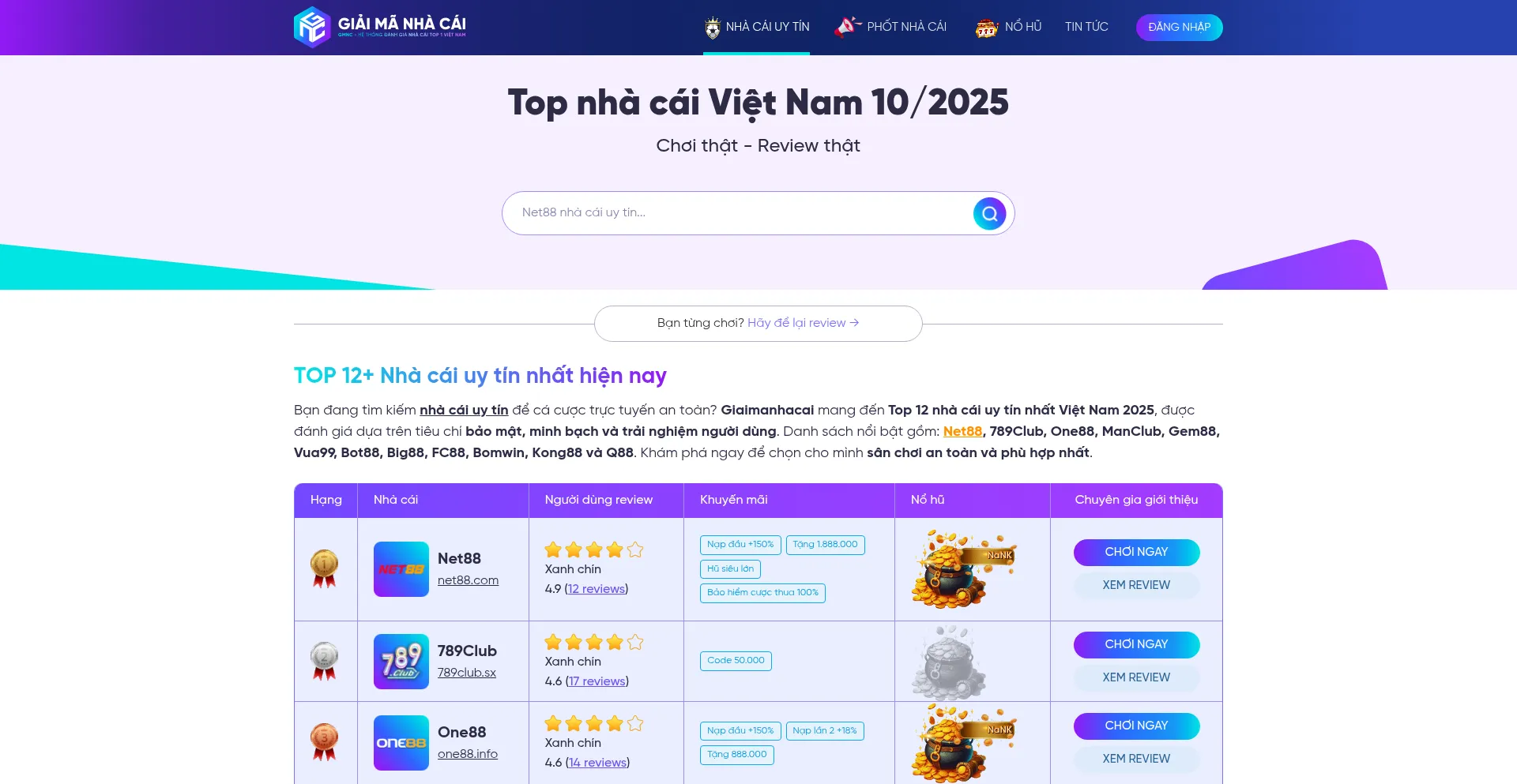 Giaimanhacai - TOP 12 nhà cái uy tín 2025: Xo88, Net88,... về, tỷ lệ cược hấp dẫn, dịch vụ chuẩn quốc tế. Trải nghiệm an toàn ngay hôm nay!