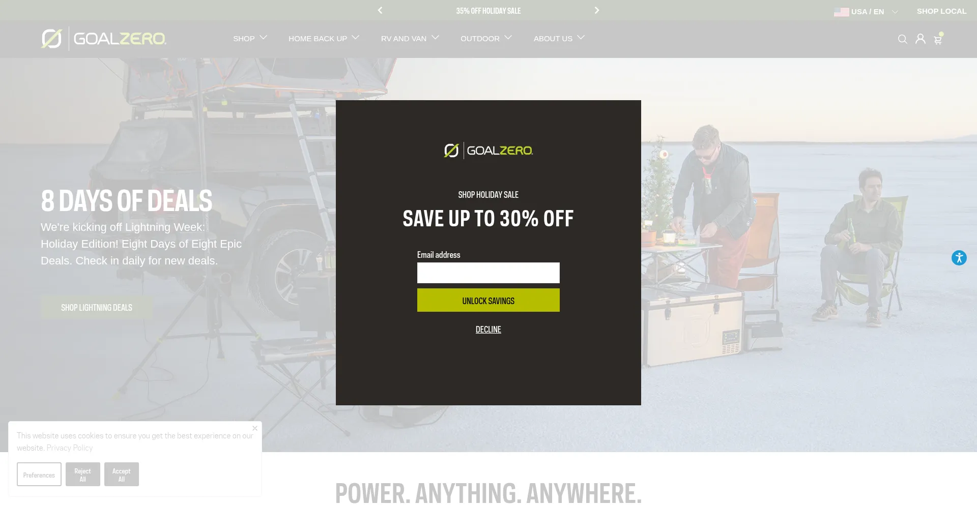 该网站实现数据收集表单,请求个人信息,包括姓名、电子邮件地址、电话号码或其他敏感详细信息。用户应验证 goalzero.com 的合法性并在提交个人数据前查看隐私政策。