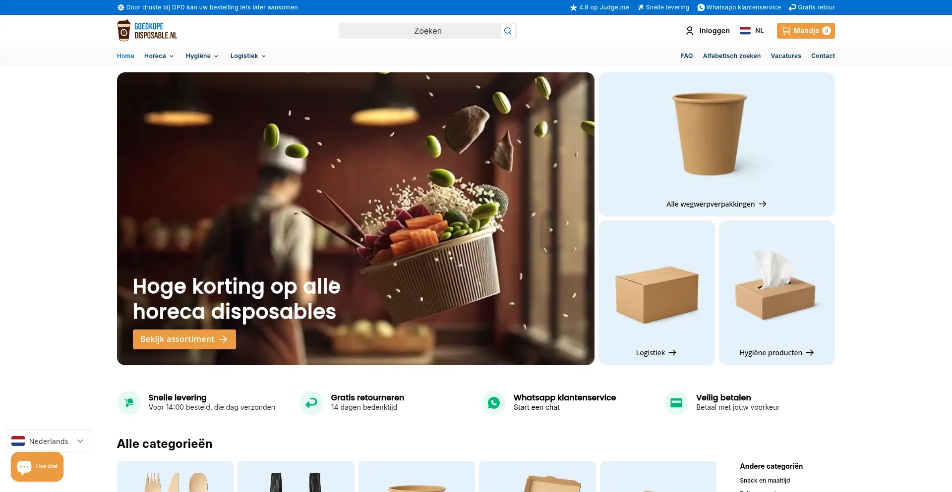 分析表明 goedkopedisposable.nl 作为电子商务平台运营,促进商品或服务的在线交易。该网站实现了购物车功能、支付处理系统和产品目录功能,这些是商业零售运营的典型特征。