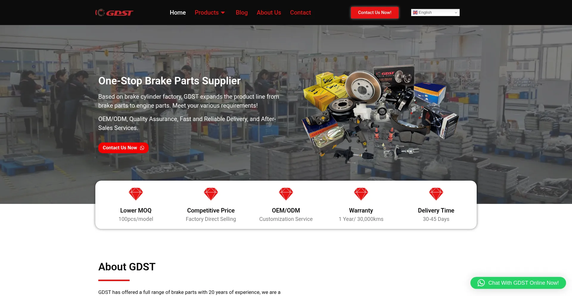GDST Auto Parts is one stop brake parts supplier, including brake cylinder, brake pad, brake shoe, brake caliper, brake disc, and brake drum.