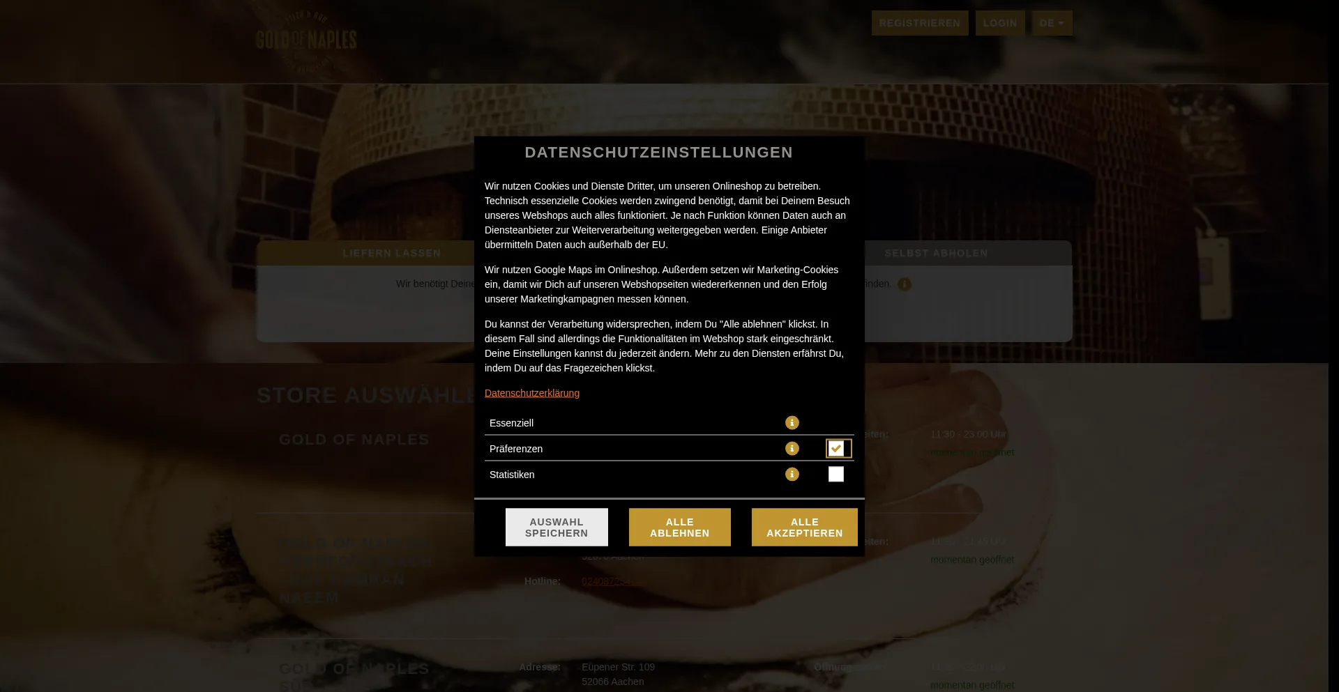 该网站实现符合GDPR或CCPA等隐私法规的cookie同意机制。这表明 goldofnaples.simplywebshop.de 遵守数据保护标准并为用户提供对个人数据收集实践的控制。