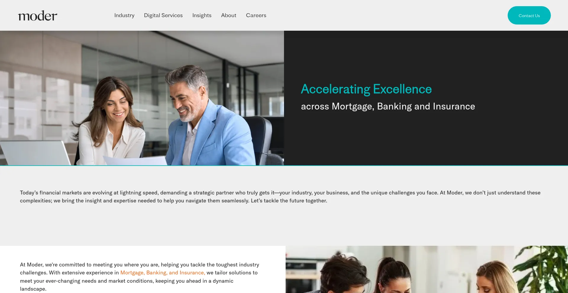 Moder delivers tailored solutions in Mortgage, Banking, and Insurance, enhancing agility and performance in a dynamic financial landscape.