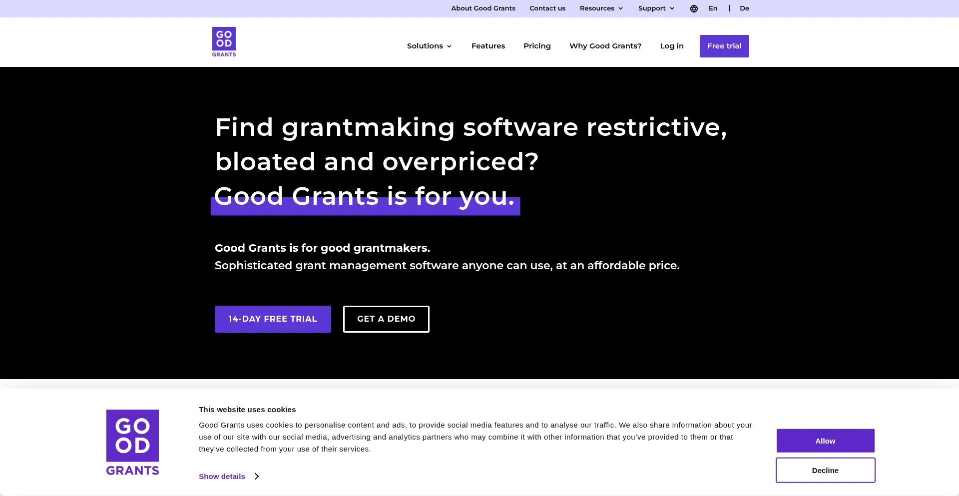 该网站实现符合GDPR或CCPA等隐私法规的cookie同意机制。这表明 goodgrants.com 遵守数据保护标准并为用户提供对个人数据收集实践的控制。
