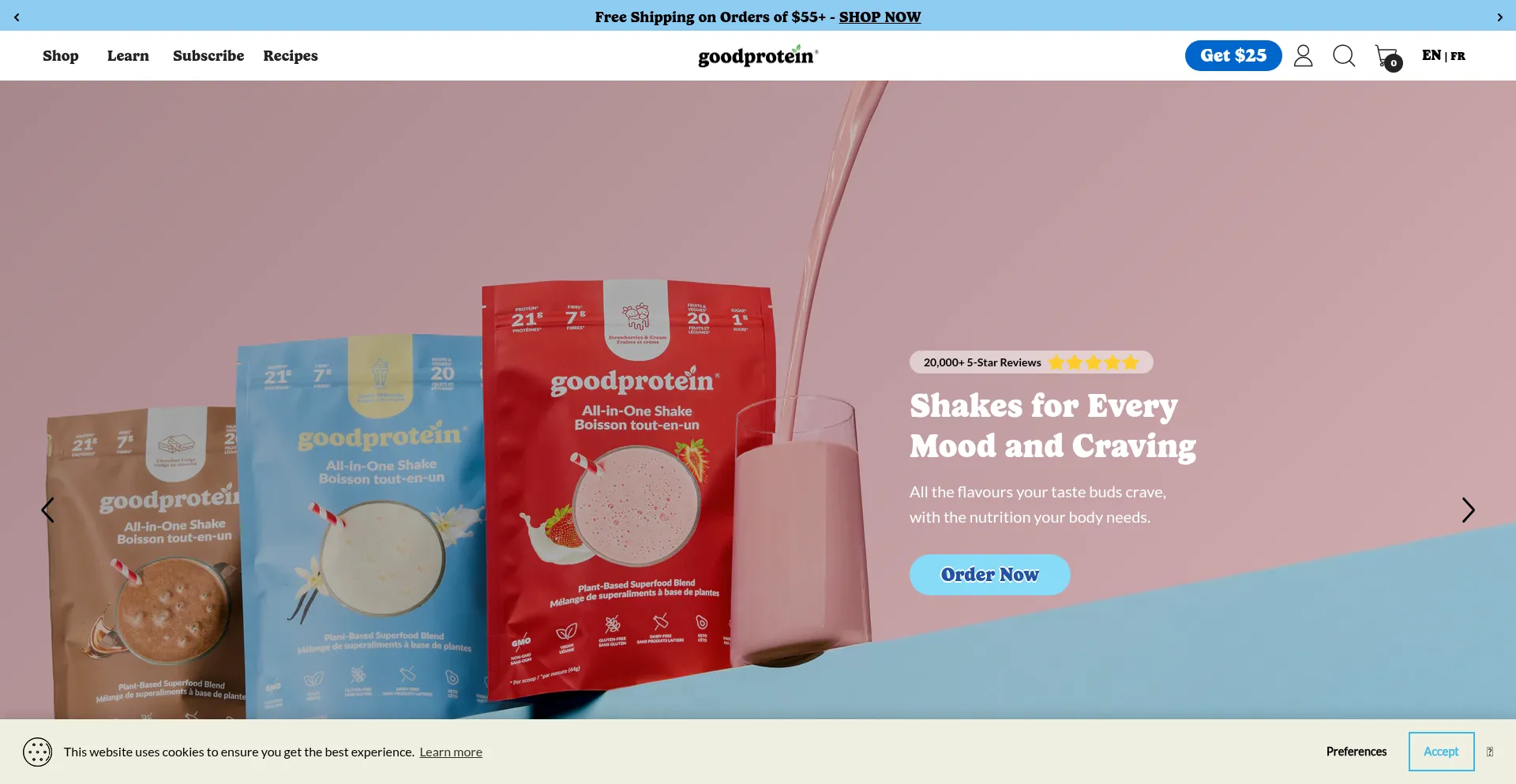 该网站实现符合GDPR或CCPA等隐私法规的cookie同意机制。这表明 goodprotein.ca 遵守数据保护标准并为用户提供对个人数据收集实践的控制。
