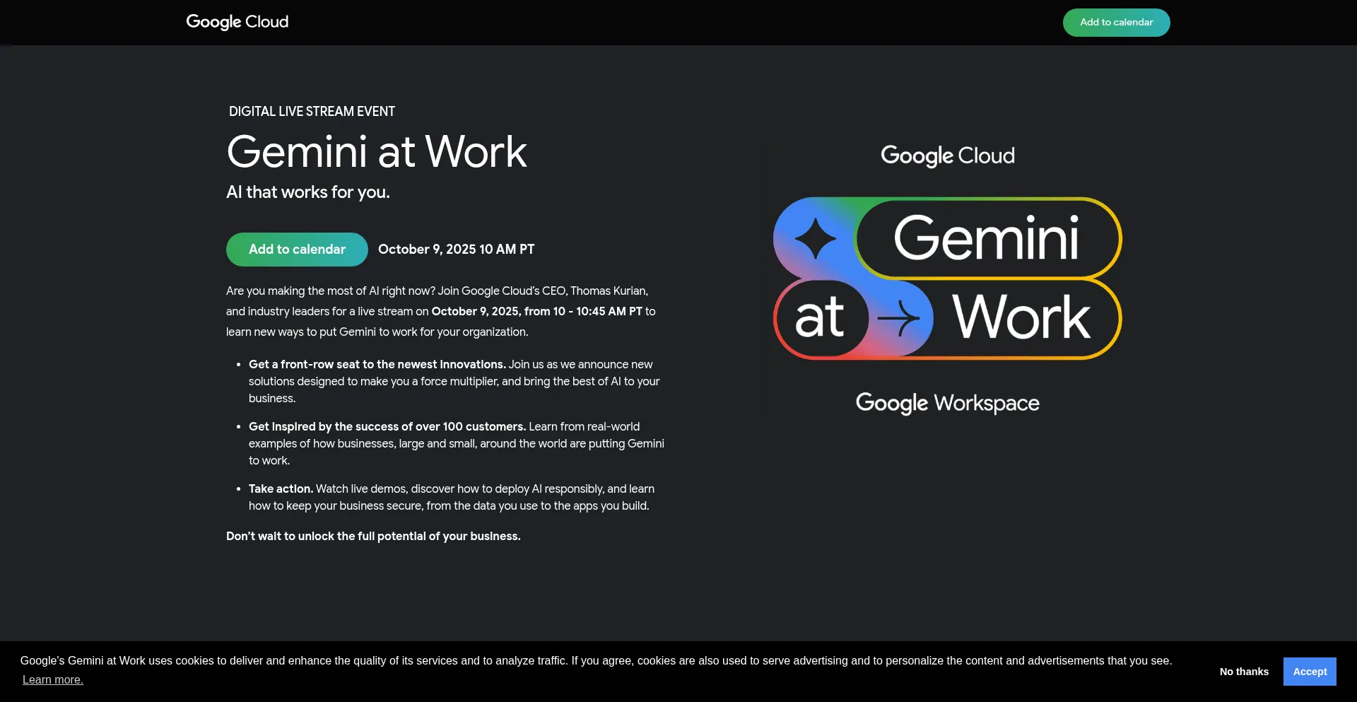 该网站实现符合GDPR或CCPA等隐私法规的cookie同意机制。这表明 googlecloudevents.com 遵守数据保护标准并为用户提供对个人数据收集实践的控制。